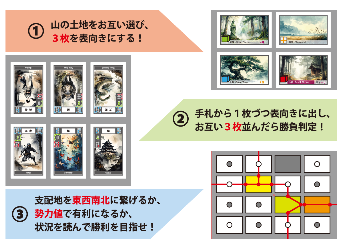 - ①土地を決める【選択】 ⇒ ②化けくらべを行う【勝負】 ⇒ ③次ラウンドに向けた【移行】。これらを1ラウンドとし、最長で4ラウンド行います。ただし、優れたプレイをすると瞬時に勝敗が決まることも。