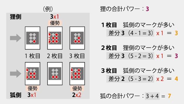 1回目の勝利プレイヤーは、新しく担当する狐狸カードを使い、外周に戦績コマで勝利点を示します。