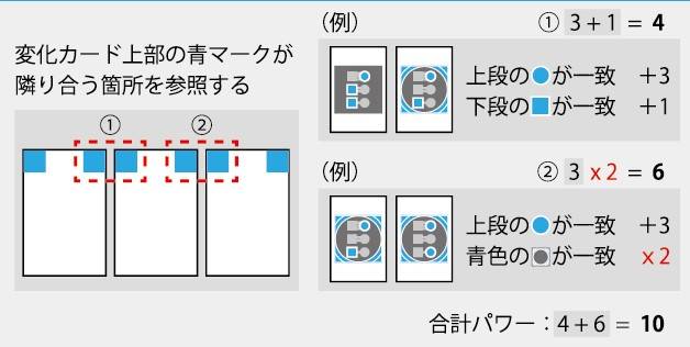 ・赤色の図形(印)有りの変化カードで差分のパワーを得る場合、図形の個数に伴いパワーを乗算します。