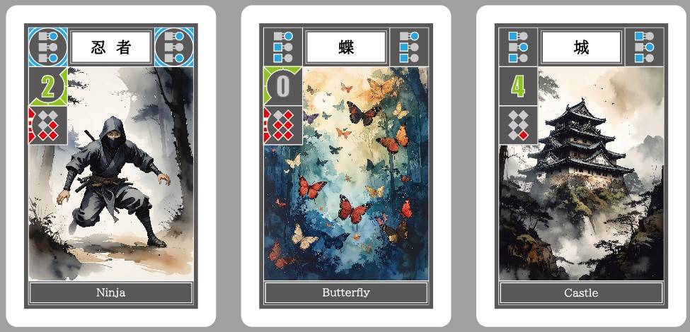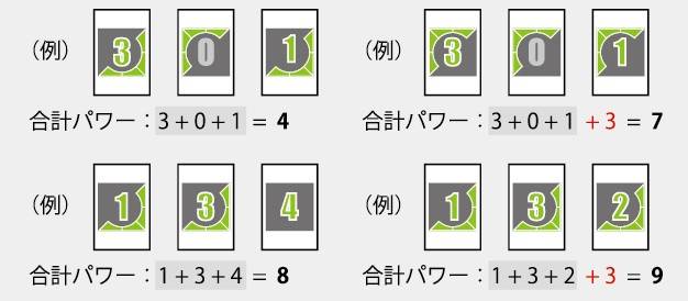 ・緑色の図形(印2種)が3枚すべて同じ形の場合、ボーナスで+3のパワーを得ます。