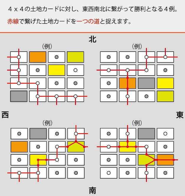 ・各ラウンドの判定終了後、自身の支配地と中立地を繋げて、一つの道で東西南北に繋がるプレイヤーは、