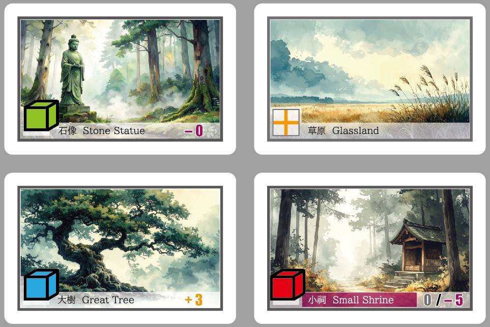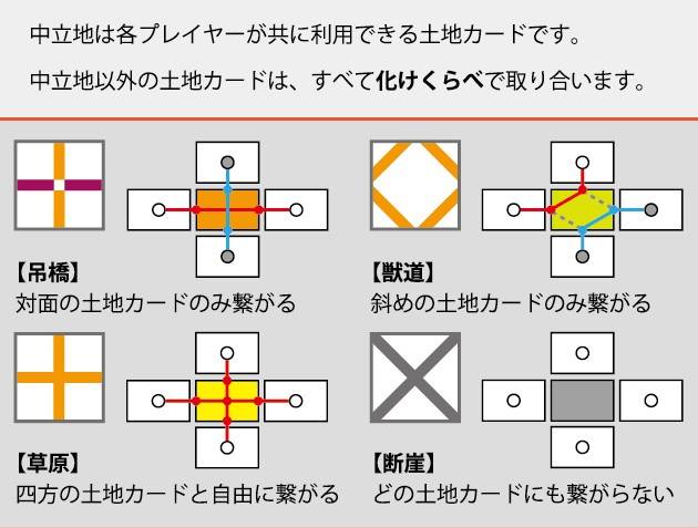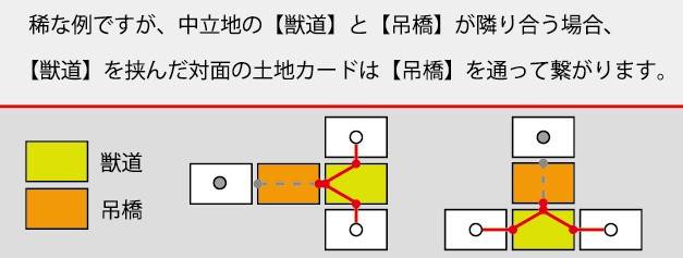 ・【吊橋】と【獣道】の中立地は【草原】と同等の効果となり、四方の土地カードと自由に繋がります。