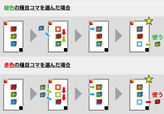 もし緑色か赤色の種目コマを選んだ場合、下図に従い、種目コマを配列変更した後、