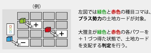 ・各ラウンドの判定終了後、勢力コマの位置が+8以上の場合、そのプレイヤーは即勝利となります。