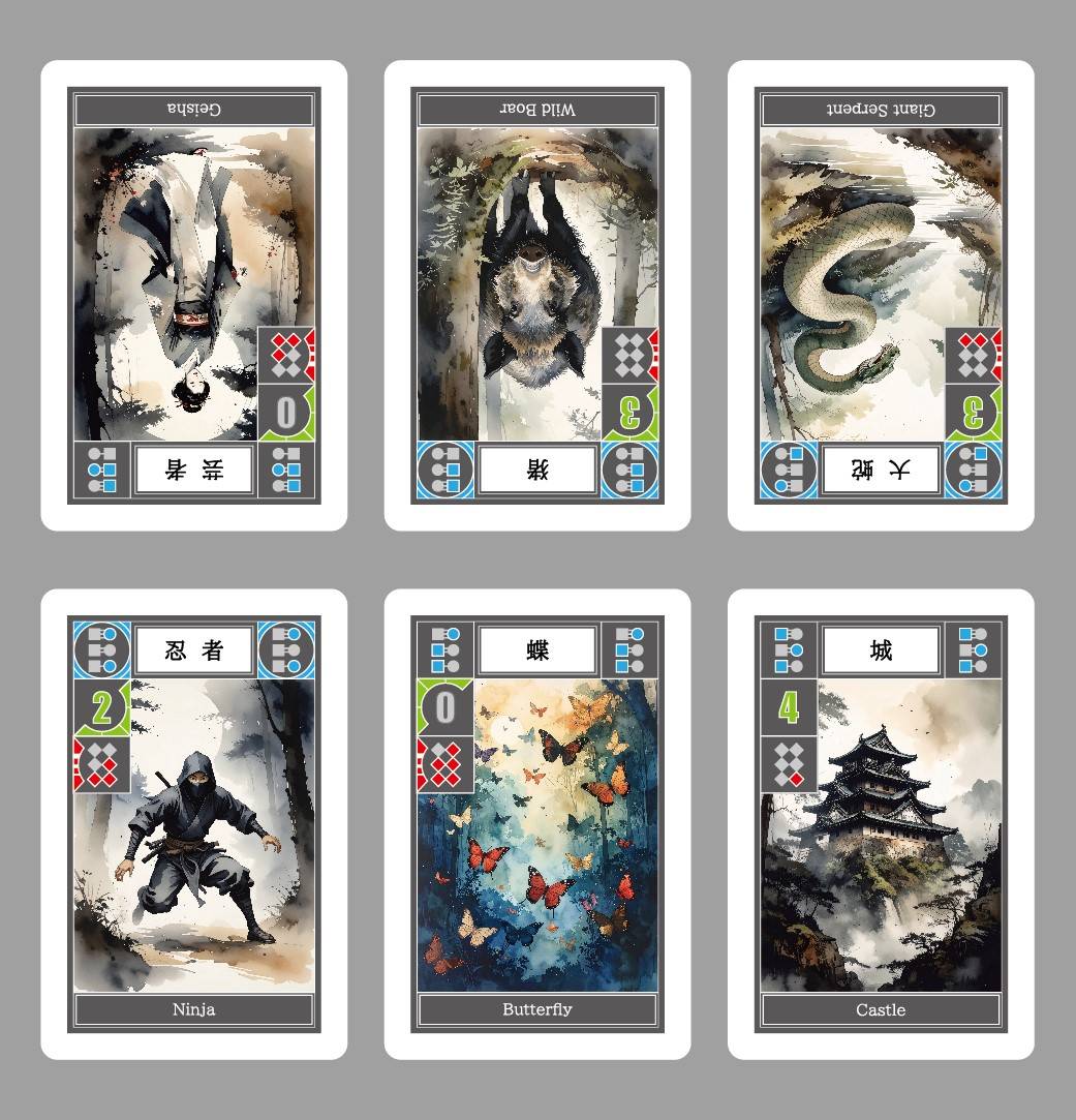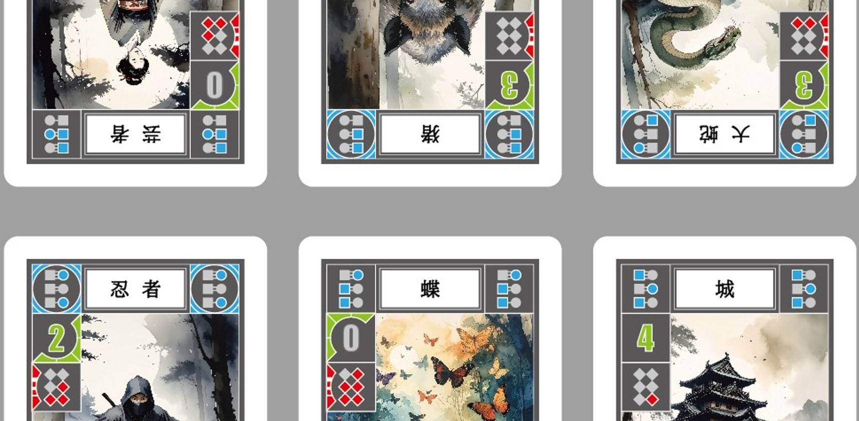 『ばけぬし』は、狐と狸の〈化けくらべ〉をテーマにした2人専用対戦ゲームです。毎ラウンドごとに山地の支配権が3箇所賭けられ、それらを変化カードによる〈 化けくらべ 〉で獲得を競います。支配地が東西南北に繋がるか、勢力値が±8に達すると即勝利(もしくは即敗北)。陣取り要素、計算要素、心理戦要素を巧みに操り、化け技の見事な山の主・・・そう、”ばけぬし”を目指しましょう!