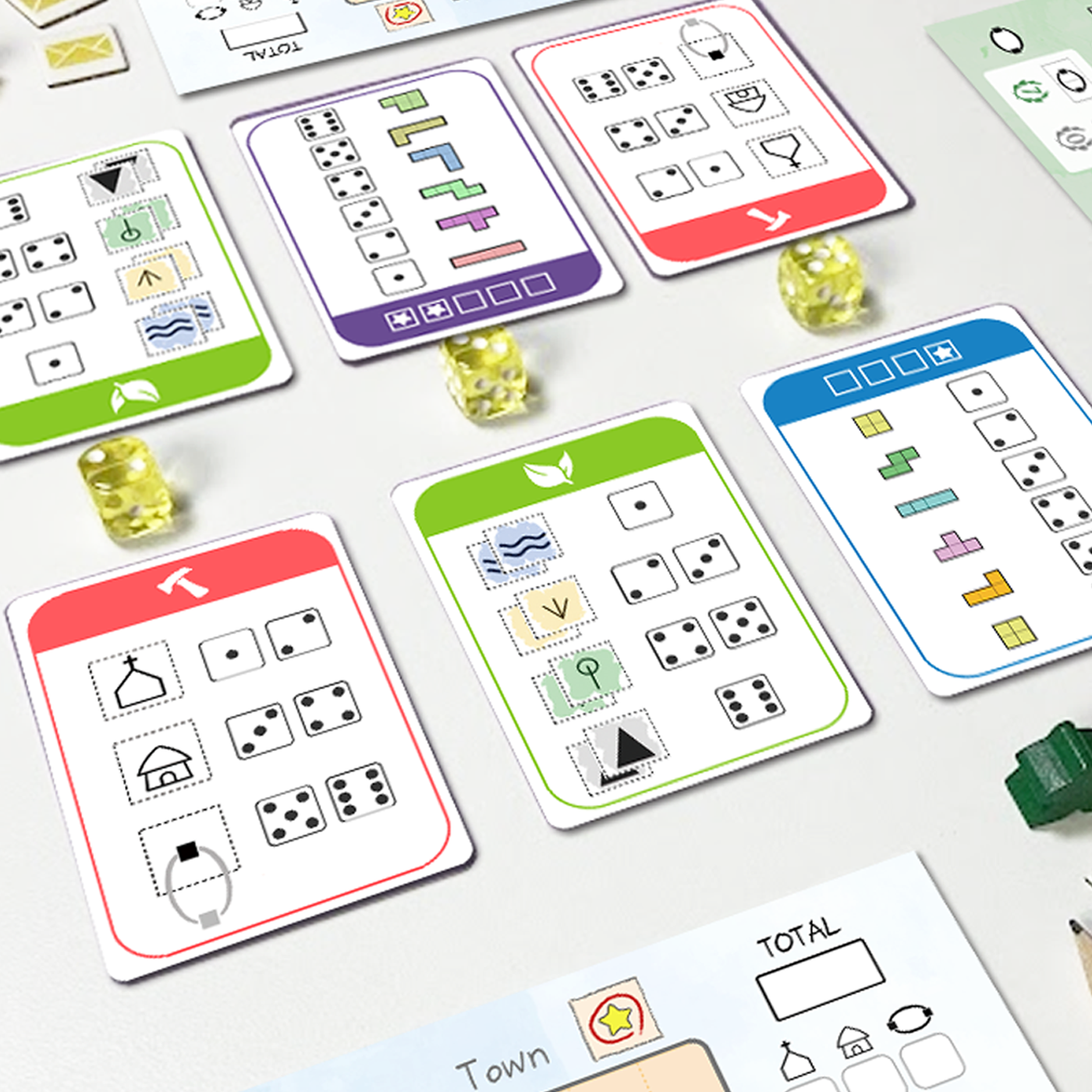 二人のプレイヤーは9ラウンドにわたり、最も素敵な町を作るために競い合います。毎ラウンド、3つのサイコロの出目を共有して使いますが、それぞれどのカードをどのサイコロと結びつけるかによって、異なる町を作り上げていきます。