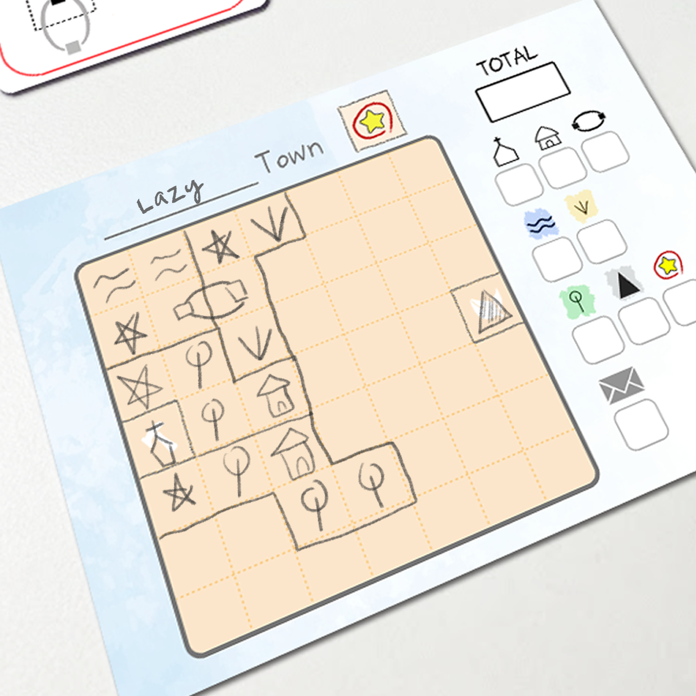 描画フェーズは同時に進行し、それぞれ自分のカードがどのサイコロの前に置かれるかによって、描くブロックの形、建物の種類、自然の種類が決まります。それに従って自分の町の好きな位置に形を描き、その中に建物や自然、そして星を描き込みます。