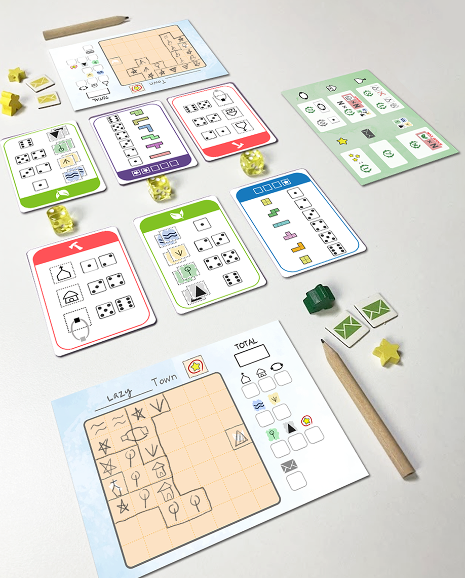 ダイス・タイニータウン対決は、サイコロと鉛筆を使う2人用のロール&ライト(roll-and-write)ゲームです。