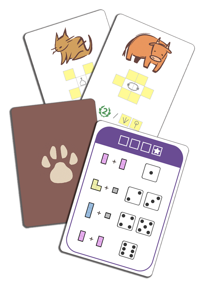 動物カードモジュールは、新たな得点要素である動物得点を追加します。毎ゲーム、2枚の動物カードを引いて使用します。基本ルールに十分慣れた熟練者におすすめです。(動物カードモジュールは『ダイス・タイニー・タウン(2023)』でも使用できる拡張です。)