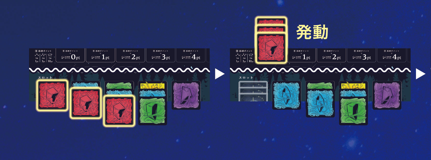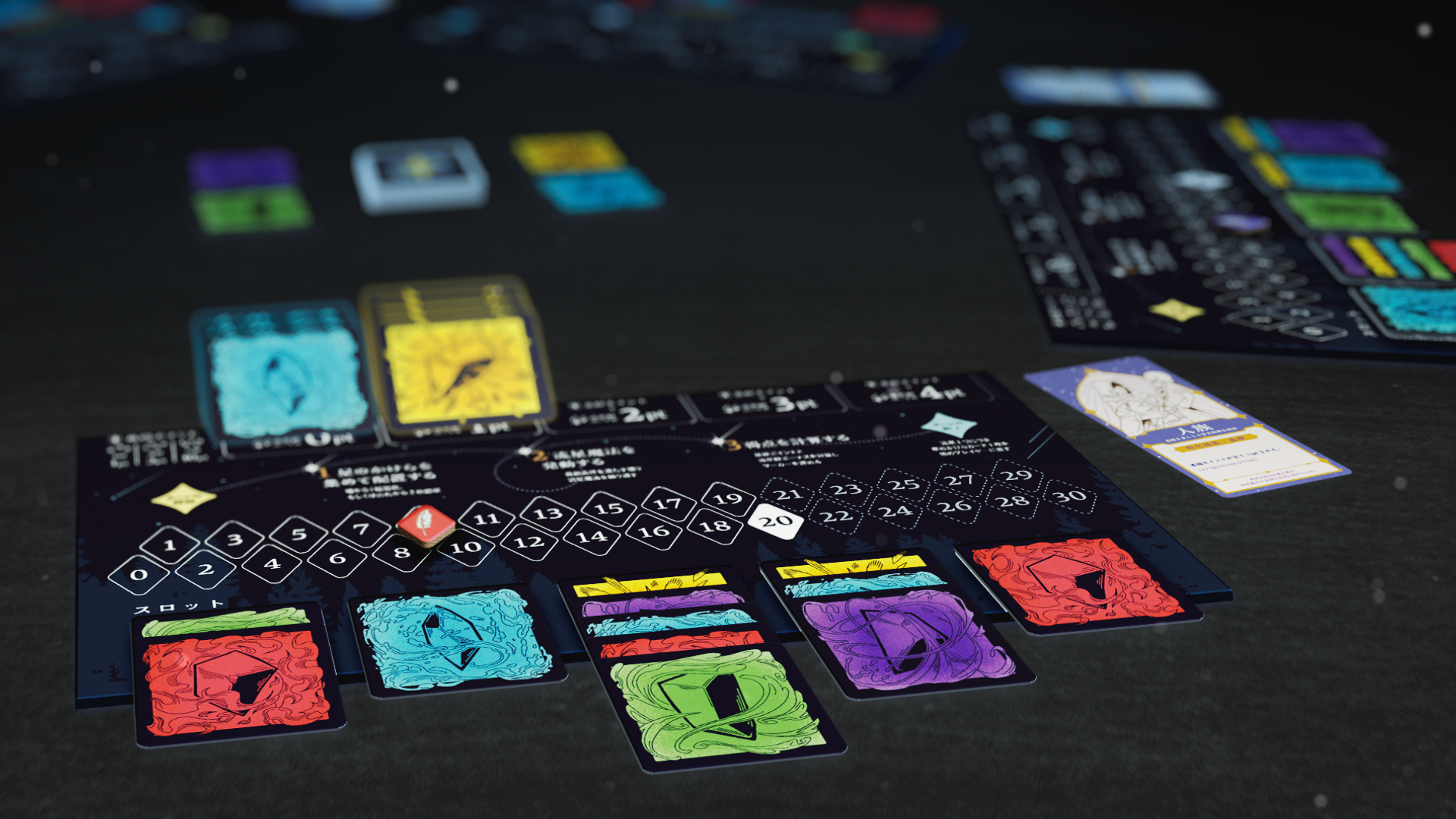 回収した2枚のカードを、自分のボードの好きなスロットの上に表向きで配置します。