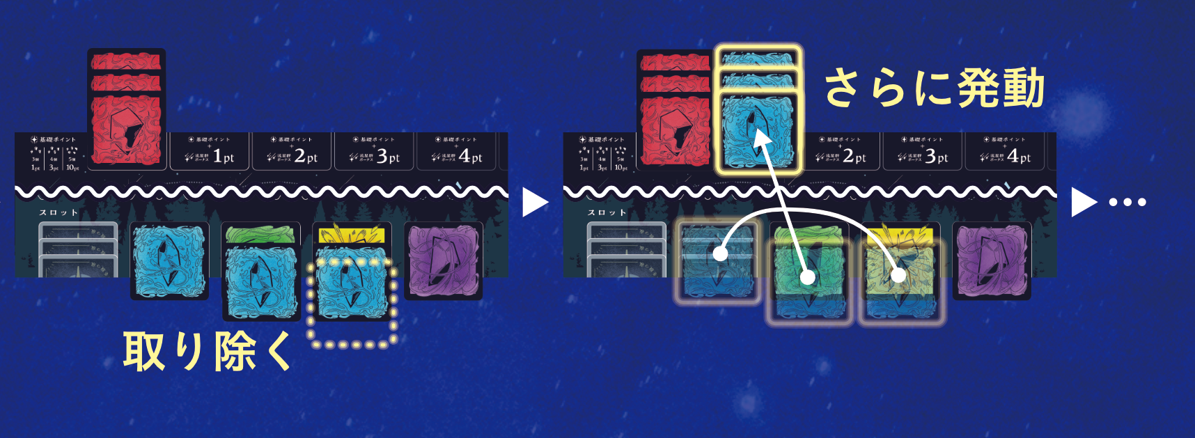 場にある2枚組の星のかけらカード2組のうちいずれか1組を回収するか、山札の上から裏向きの星のかけらカードを2枚引いて回収します。