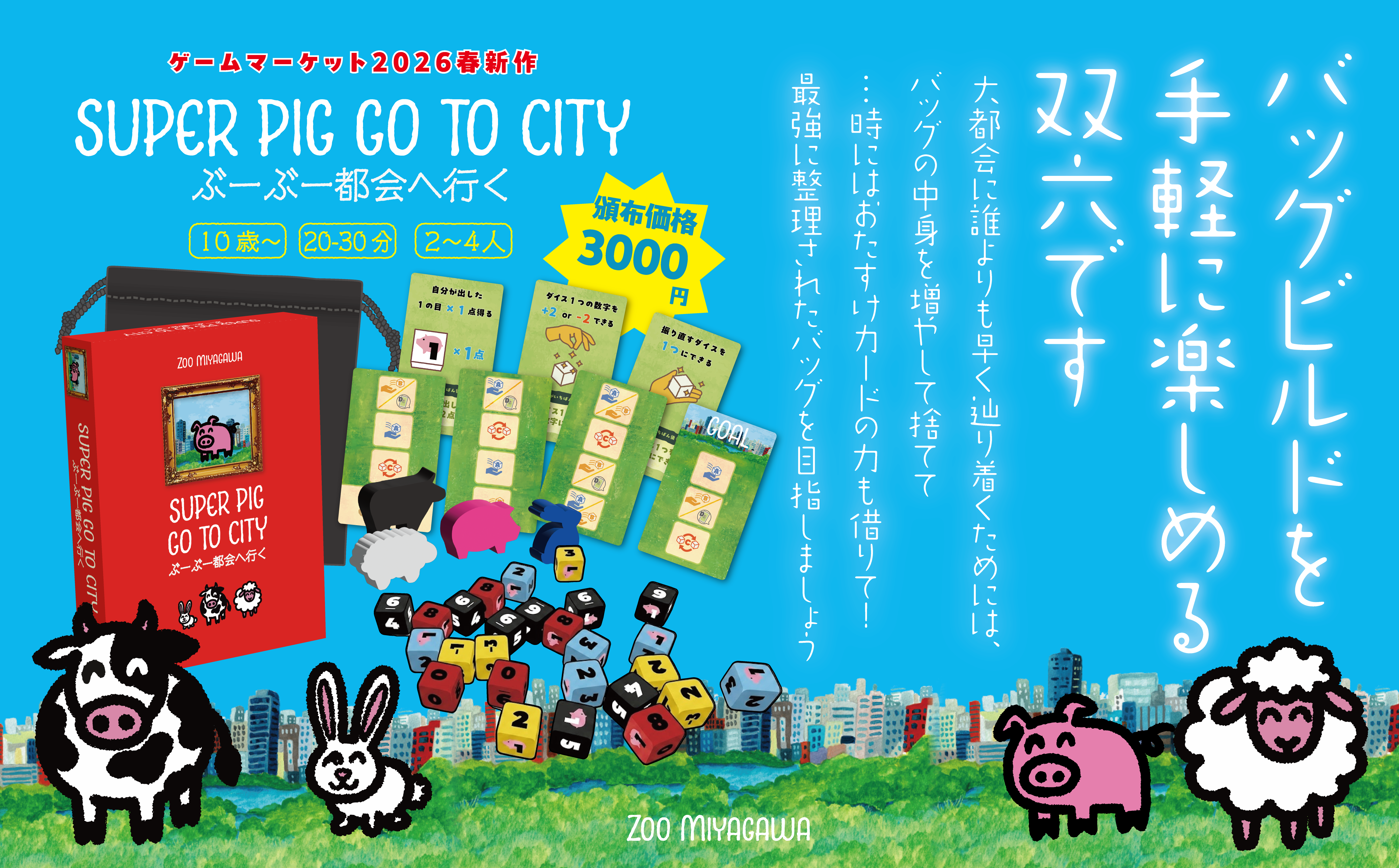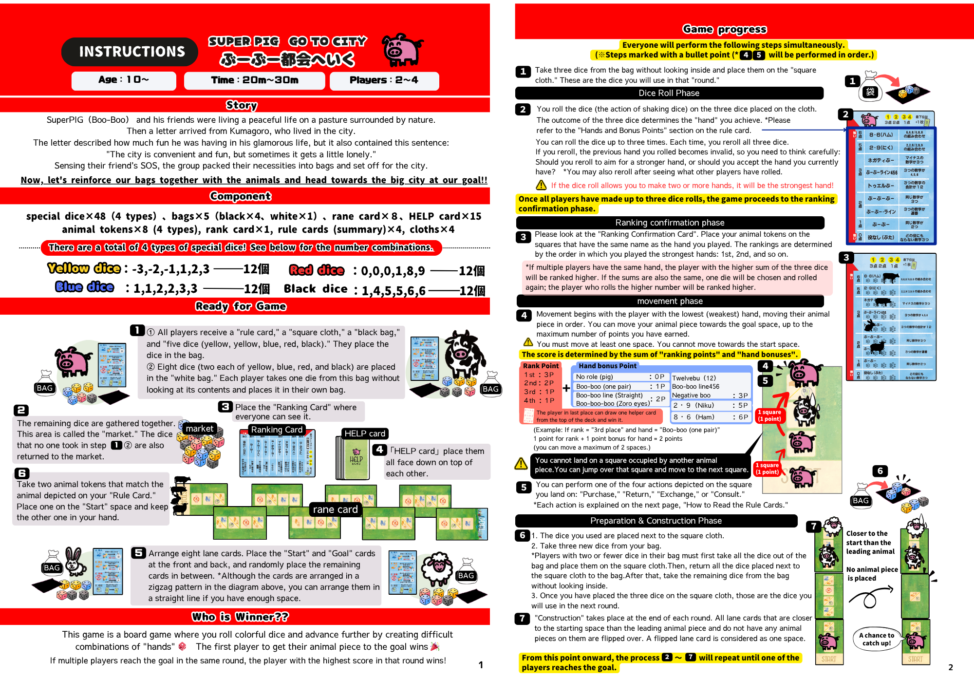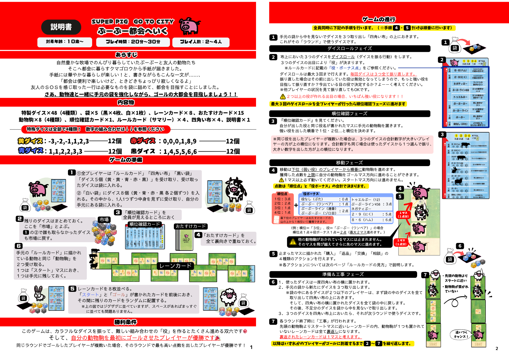 このゲームは袋の中身を強化しながらゴールを目指すバッグビルドすごろくです🎲🐖 サクッと遊べる構築ゲームを目指して作りました!! 20~30分で遊べるバックビルディングの世界をお楽しみください✨ プレイ人数:2~4人 対象年齢:10歳~ プレイ時間:20~30分 【あらすじ】 自然豊かな牧場でのんびり暮らしていたぶーぶーと友人の動物たち。 そこへ都会に暮らすクマゴロウから手紙が届きました。 手紙には華やかな暮らしが楽しい!と、書きながらもこんな一文が……、 「都会は便利で楽しいけど、ときどきちょっぴり寂しくなるよ」 友人のSOSを感じ取った一行は必要なものを袋に詰めて、都会を目指すことにしました。 【内容物】 特製ダイス×48(4種類)、袋×5(黒×4枚、白×1枚)、レーンカード×8、おたすけカード×15、動物駒×8(4種類)、順位確認カード×1、ルールカード(サマリー)×4、四角い布×4、説明書×1 【勝利条件】 自分の動物駒を最初にゴールさせたプレイヤーが優勝です! 【ゲーム概要】 ※システムオンリーでβ版を頒布していました。 完成版をお届けします~🐽 各プレイヤーは小袋(バッグ)1つを受け取ります。 その中に4種類の特殊ダイスを放り込んだら準備OK!! 袋から3つのダイスを取り出して振ります。 出目によって強さが決まっている役を作ります。 ダイスは3回まで振り直せるので、より強い役を目指して祈りながら振りましょう。 全員がダイスを振り終わったら、役の強さを比べます。 より強い役を出したプレイヤー程、遠くのマスまで進むことができます✨ そして、止まったマスによって定められたアクションを行います。 アクションは。ダイスの取得・交換・廃棄または出目をコントロールできる『おたすけカード』を手に入れるという4種類です。 オリジナルの強力なバッグを作って、他のプレイヤーより先にゴールを目指しましょう🔥 ※説明書公開していますので、ぜひルール見て遊びに来てください👀