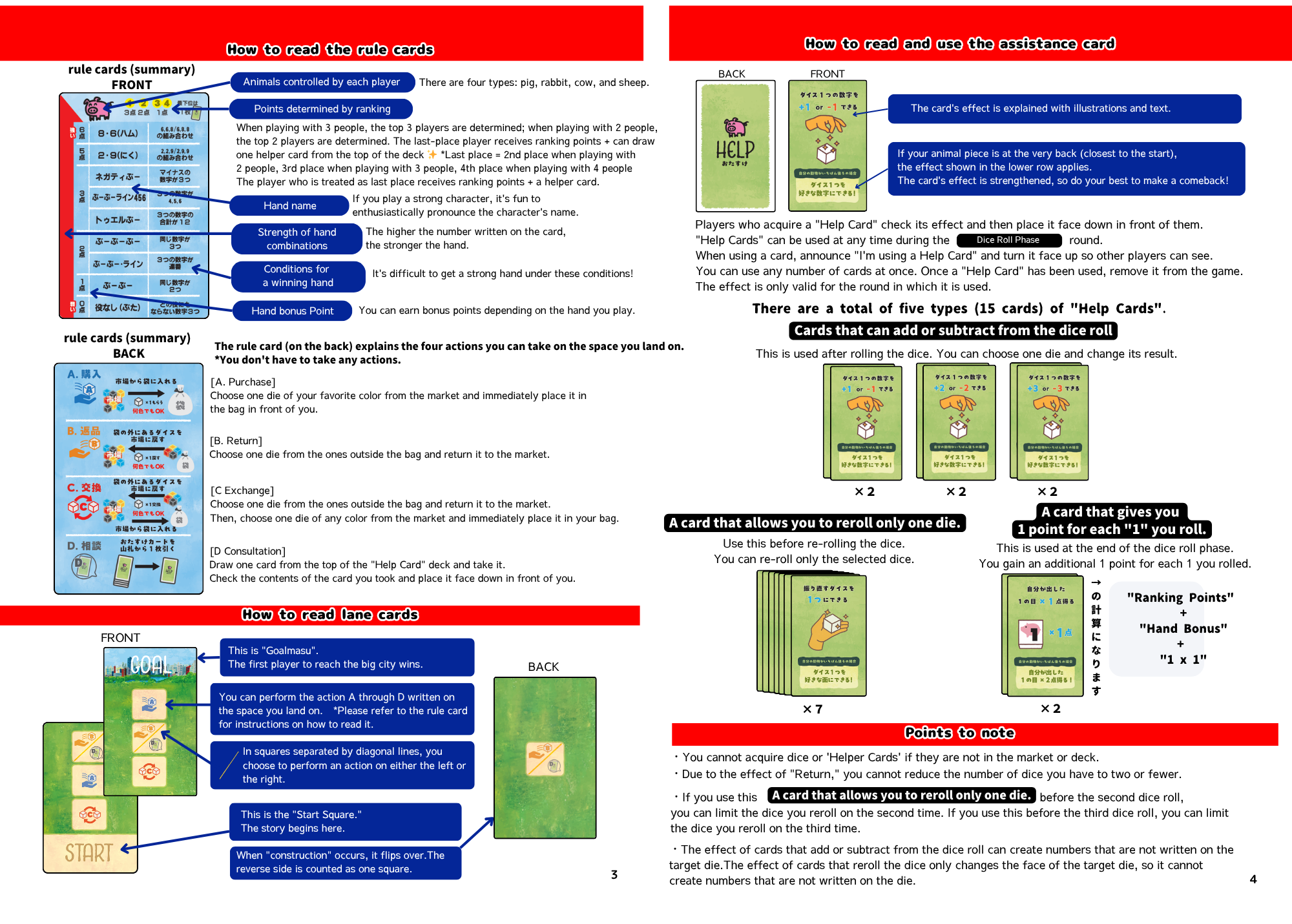 Special dice ×48 (4 types), Bags ×5 (4 black, 1 white), Lane cards ×8, Help cards ×15, Animal pieces ×8 (4 types), Ranking card ×1, Rule cards (Summary) ×4, Square cloths ×4, Instruction manual ×1