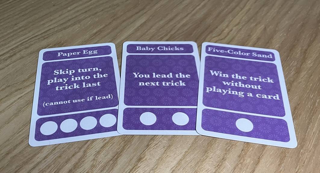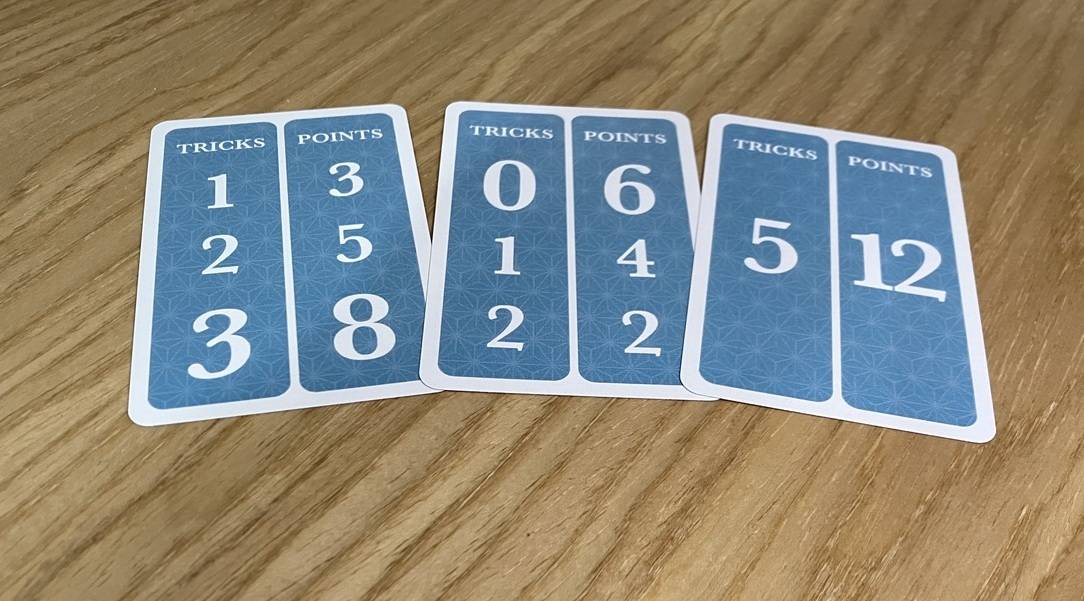 ・得点カード:「何回トリック勝ったら何点になるのか」を決めます。いくつかのパターンがあり、バランス型からリスキーでなものまで様々です。