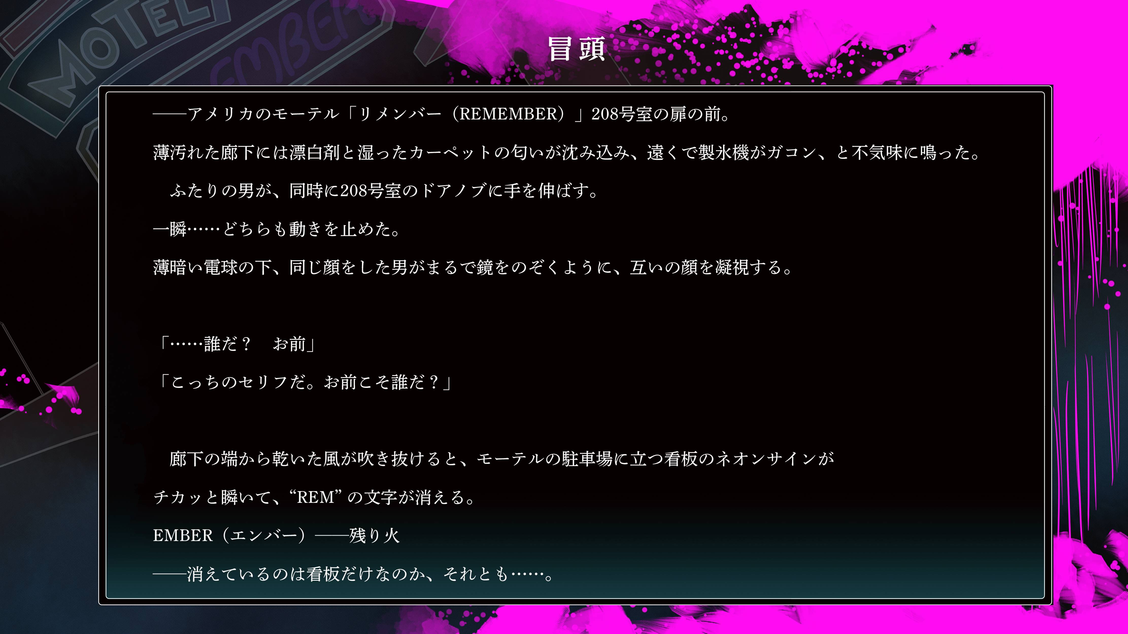 同じ顔の二人の男がモーテル・リメンバー208号室で出会う。散りばめられた謎を解き明かし、最後に迫られる選択が結末を左右する