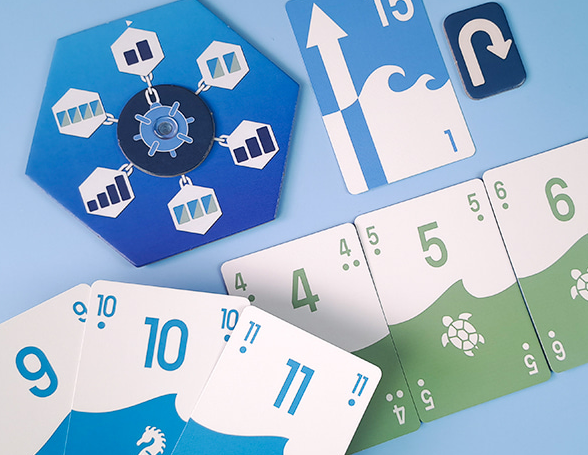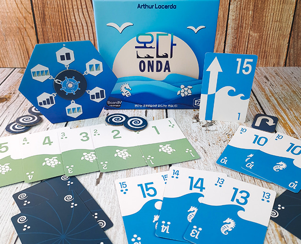 In ONDA, players use cards from their hands to compose wave formations superior to those of their opponents according to the current tide. Your goal is to be the first to play all your cards; failing that, try to have as few cards as possible since you lose points based on what's left in your hand.