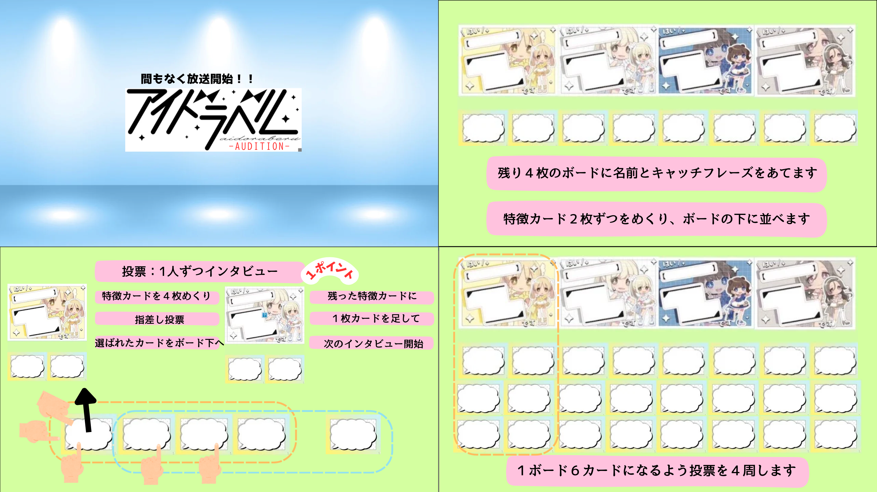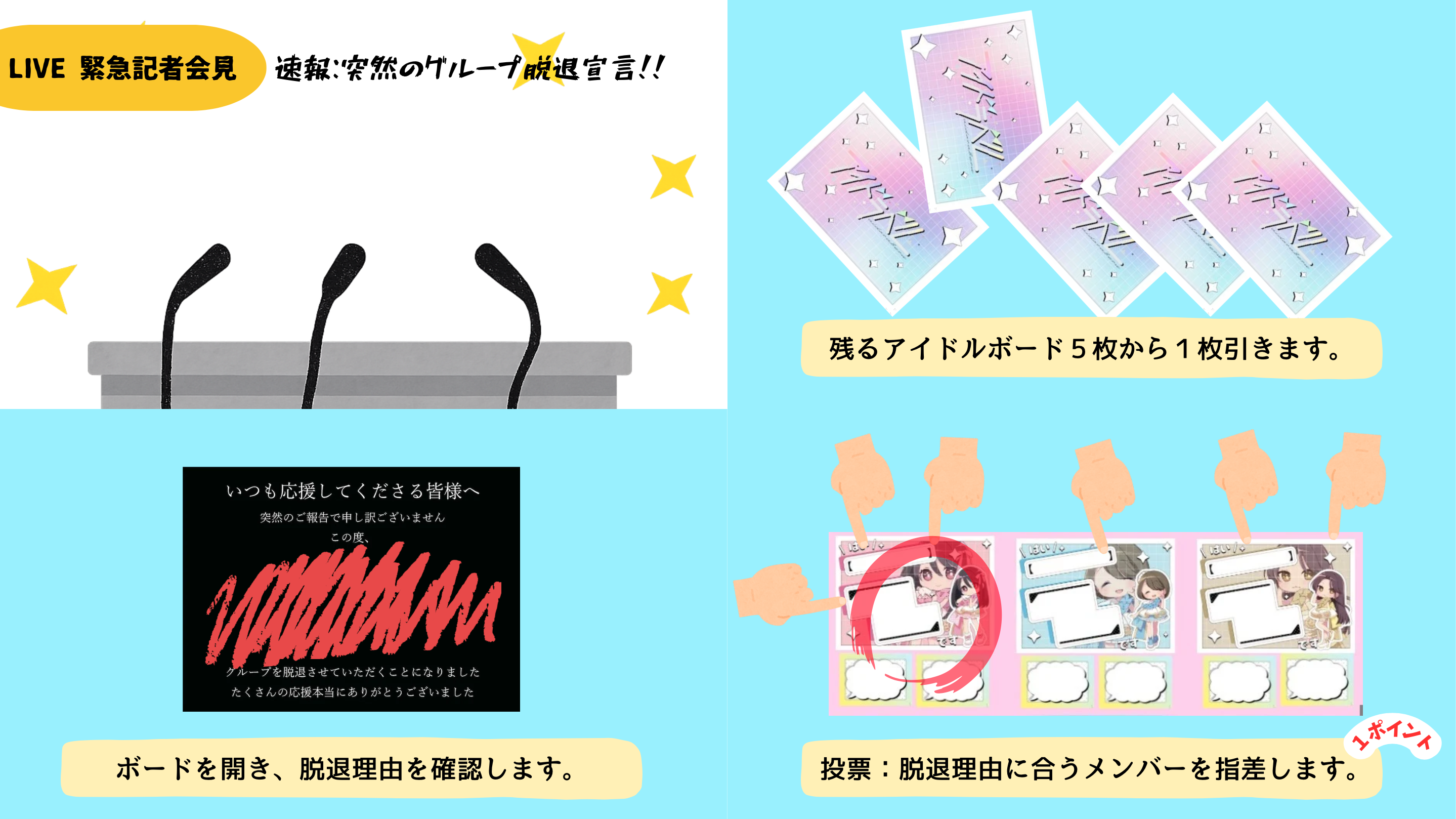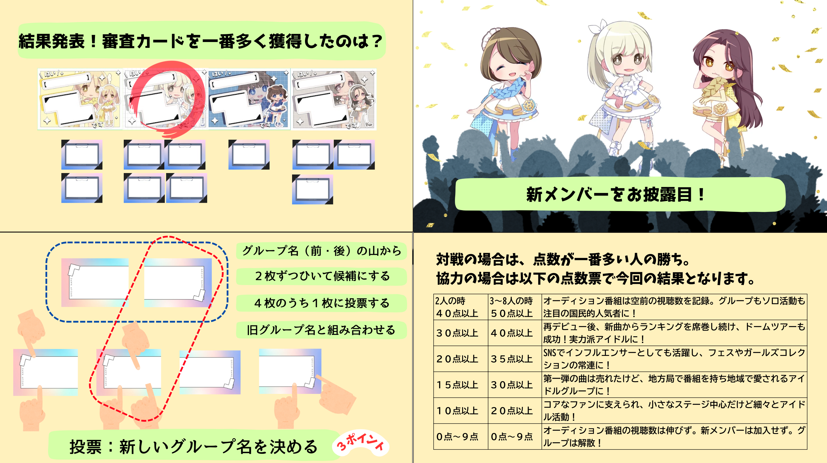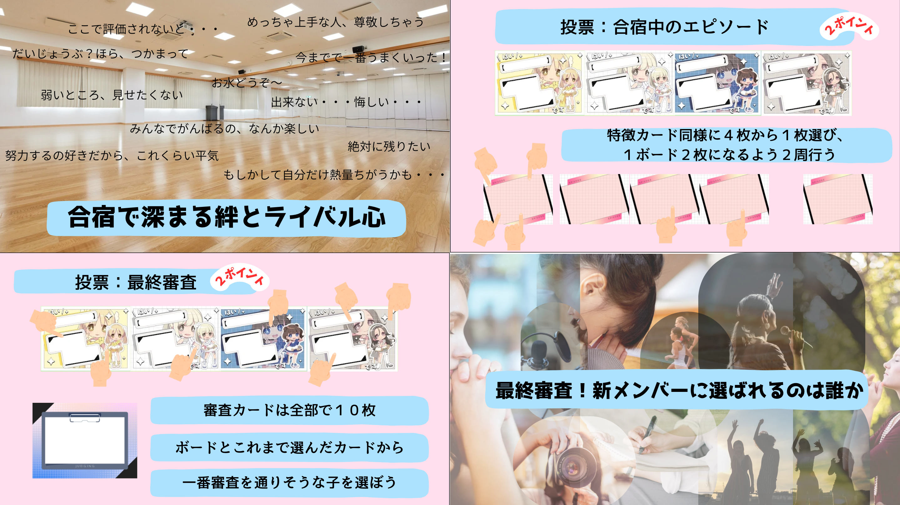 - プレイヤーは視聴者となって投票し、心を合わせて投票し、彼女たちの行方を決める得点を稼ぐ