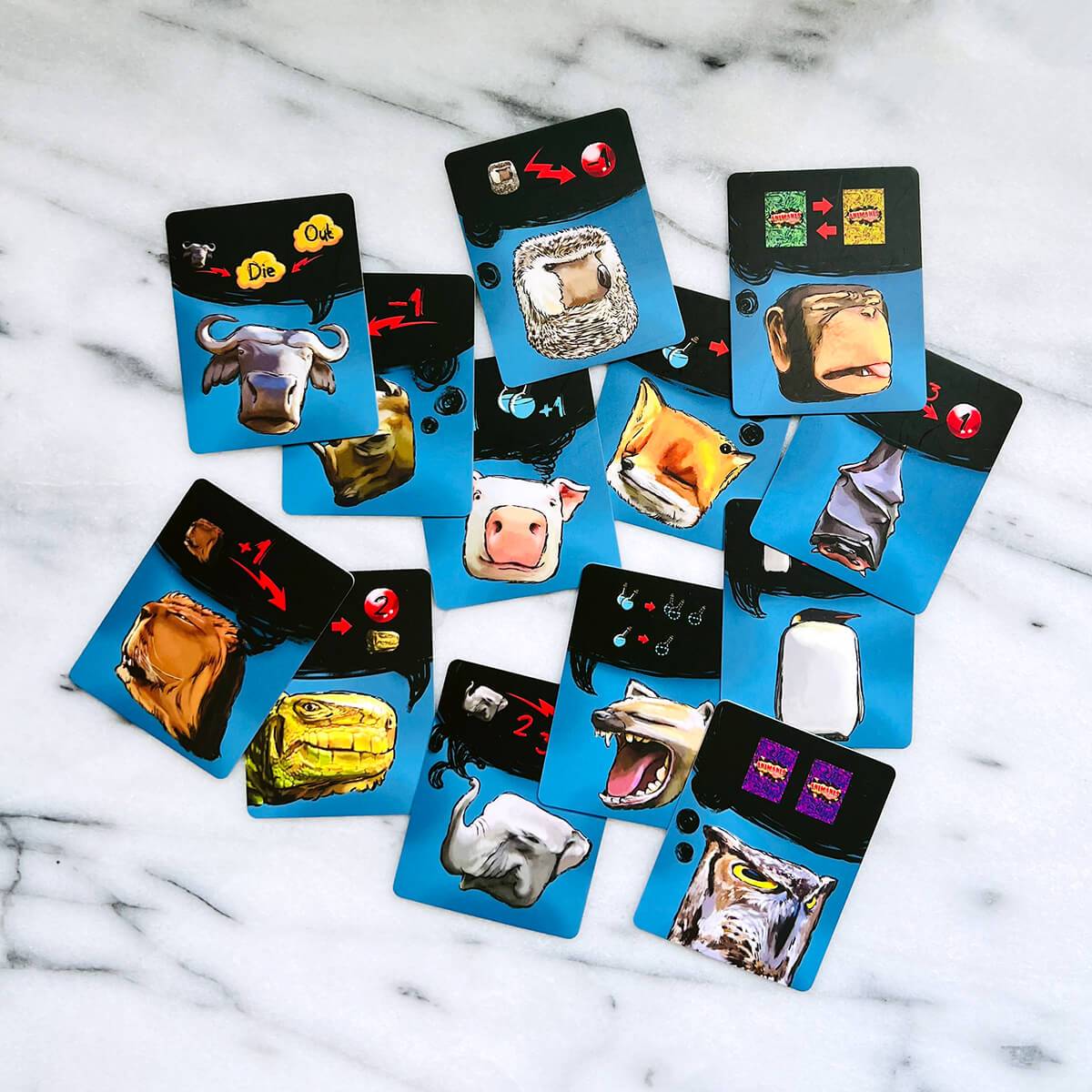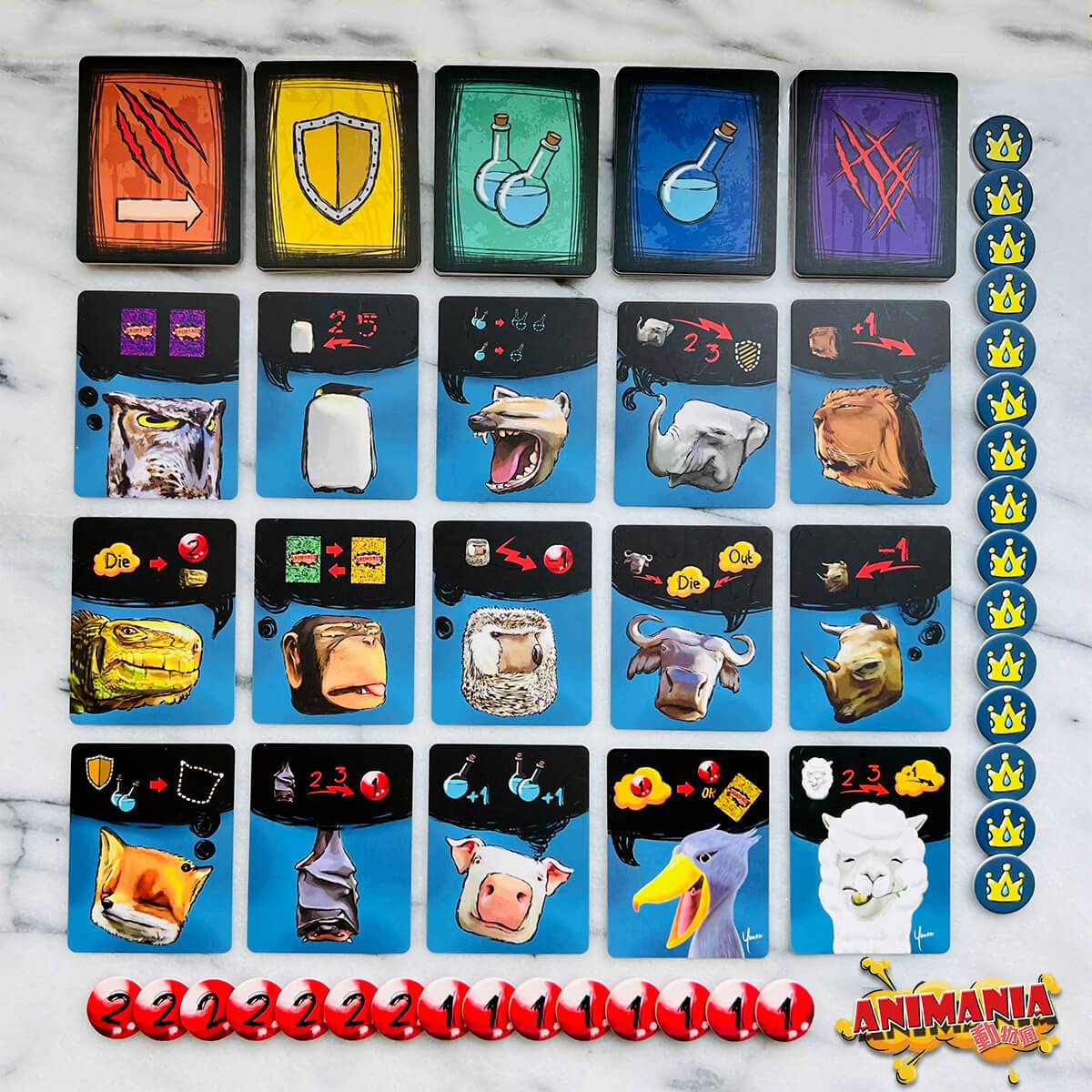 『アニマニア』は3~5人で遊べて、誰にも簡単にできるボードゲームです。楽しんでいる同時に、お互いの策略とテクニックも欠かせません!プレイヤーたちはラウンドで行動カードを出し、一緒に開けて計算します。自分の動物仲間を命じて、攻撃したり、防御したり、治したりします。ゲームの最後で一番高いHP(ライフポイント)を持つプレイヤーは勝利を手に入れます!