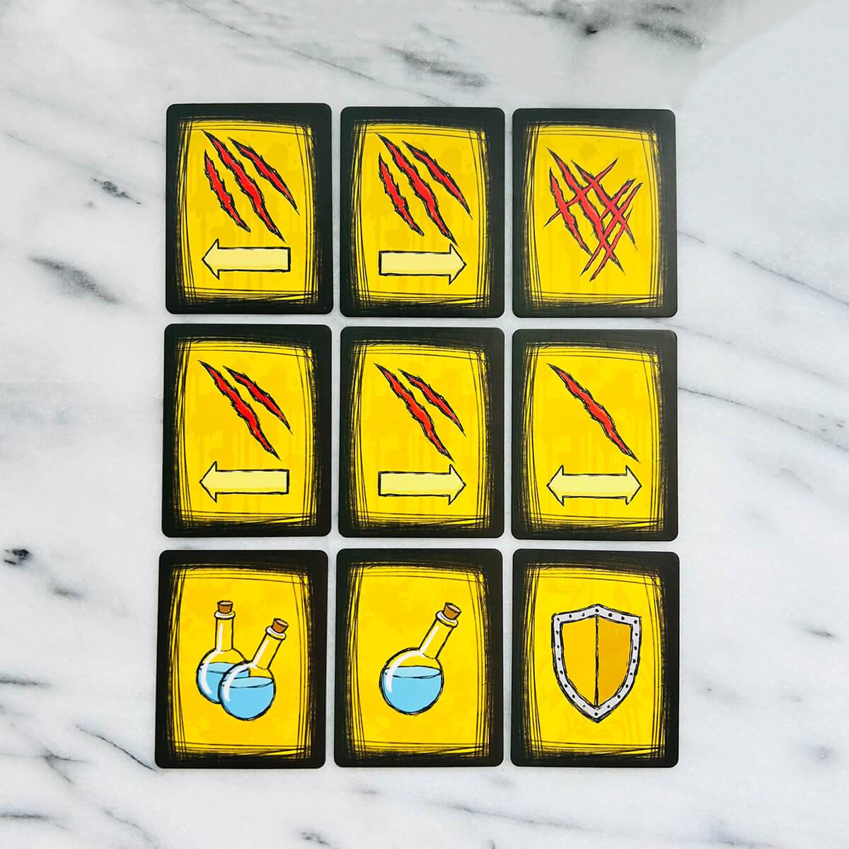 - 他のプレイヤーと同時に自分の出したカードを表にし、ダメージと効果を計算します。
