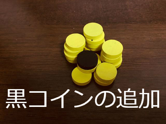 ポットの黄コインを1枚取り除き、代わりに黒コインを1枚追加します。