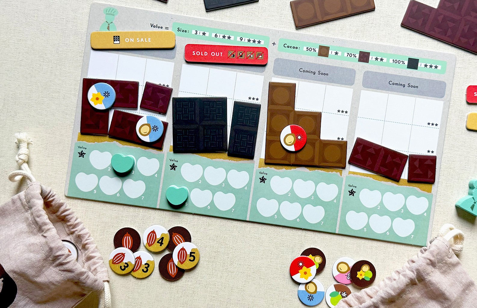プレイヤーはチョコレート職人となり、自分が本当に美味しいと思うチョコレートを世に広めるべく、自分のチョコレートブランドを立ち上げます。カカオの仕入れから商品開発、専門家の雇用、販売や人気店とのコラボ、そして年に1度のコンテストを通して、ブランド力(勝利点)を高めることを目指します。