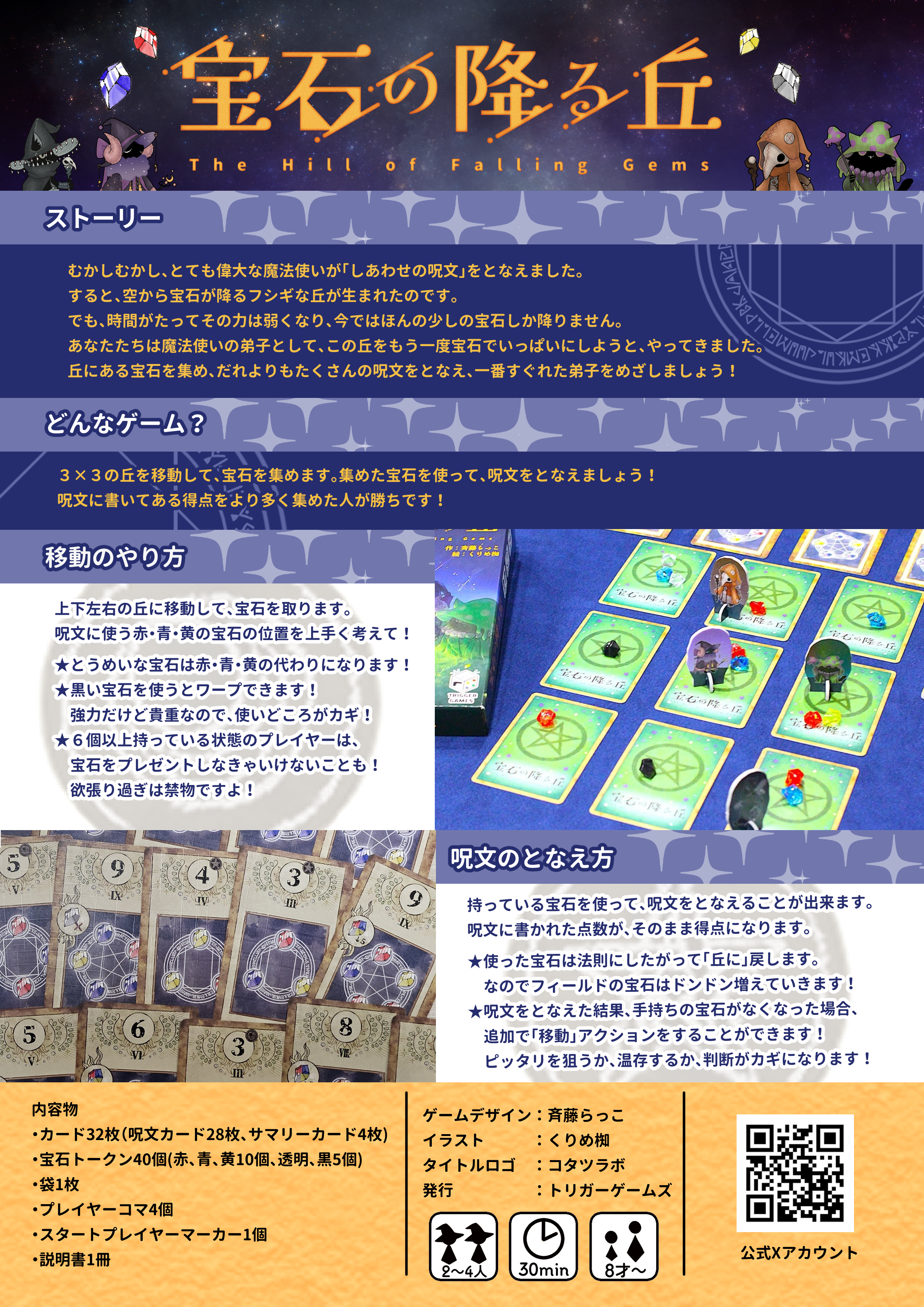 ゲームマーケット2025秋に発売するゲーム「宝石の降る丘」のチラシができました🎉
