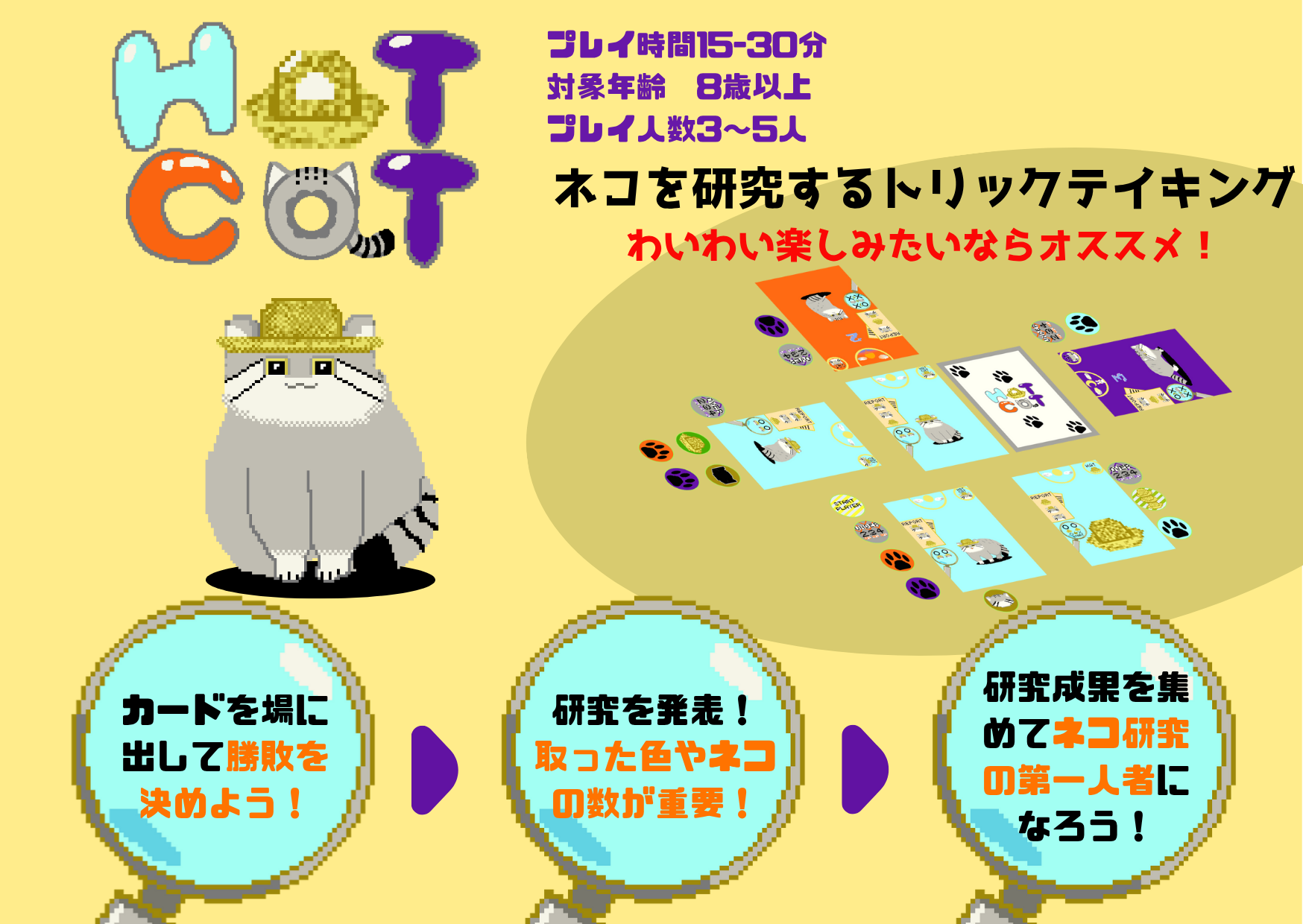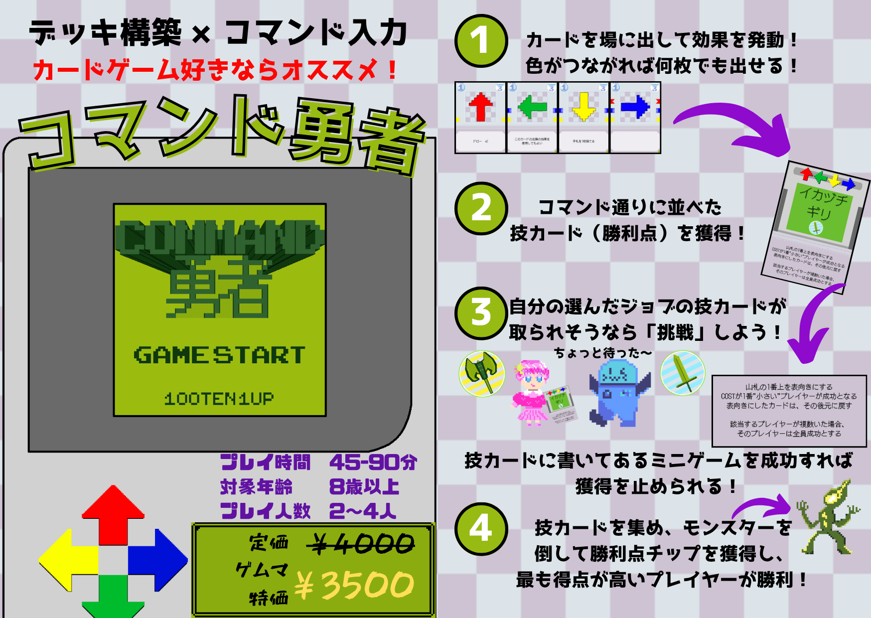 旧作デッキ構築×コマンド入力の「COMMAND勇者」とトリックテイキング×ネコ研究の「HAT CAT」を制作している100TEN1UPです。 ドットイラスト、ゲームデザインはクロキヨウスケが担当し、今回で3回目の出展となります。