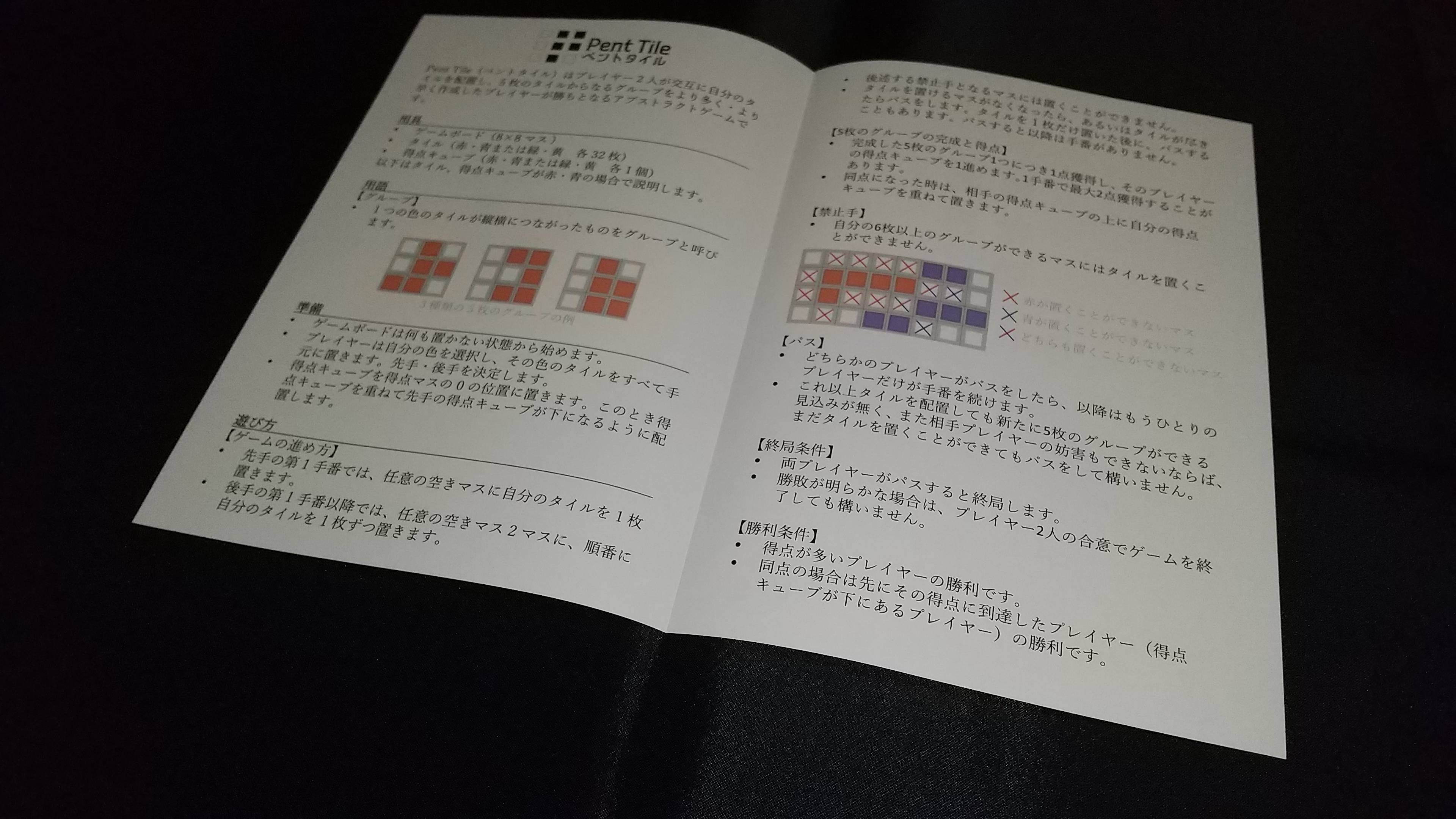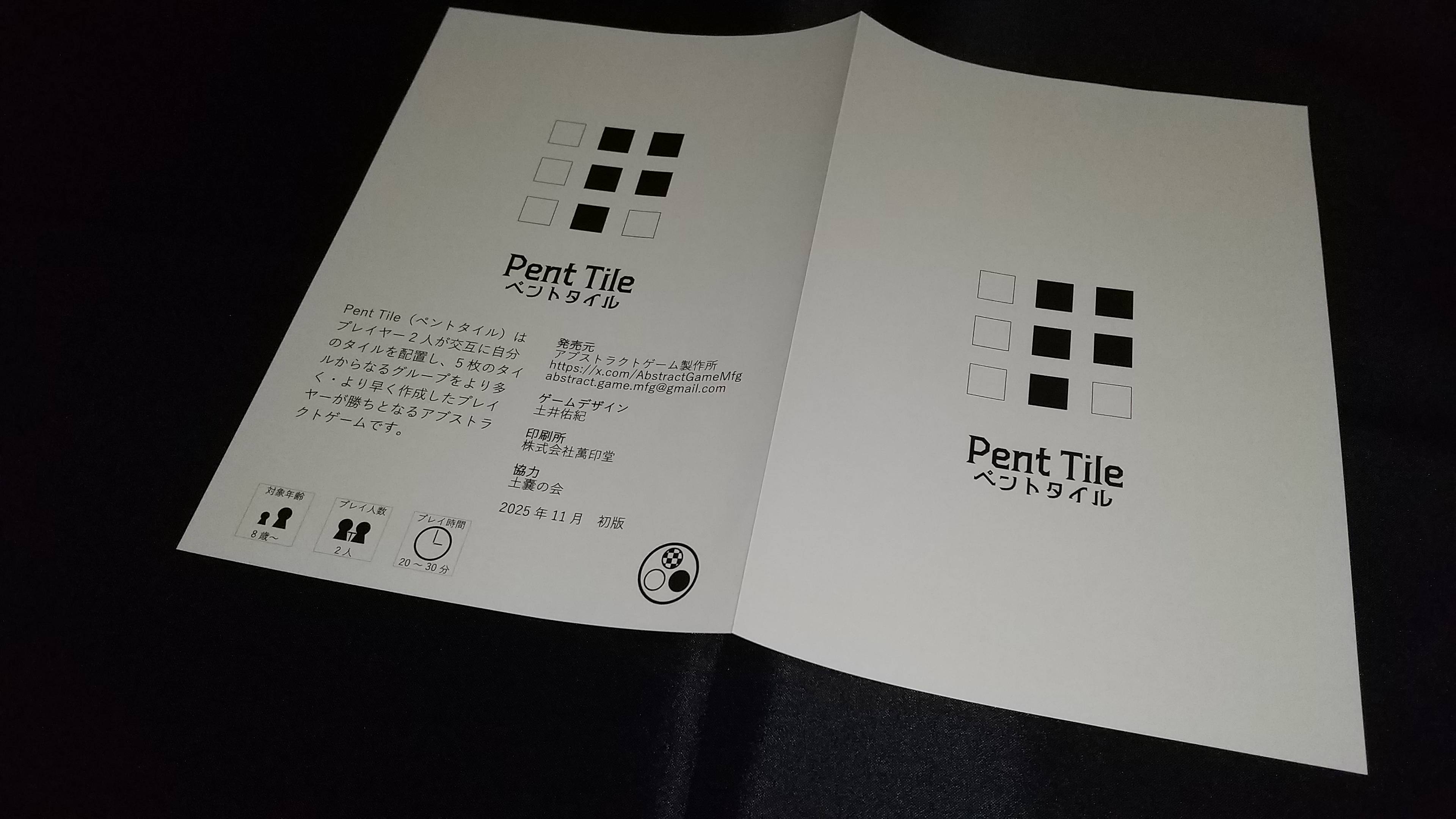 今回はゲームマーケット 2025 秋(土)横22 で頒布する新作アブストラクトゲーム「Pent Tile(ペントタイル)」(頒布価格 1,000 円)のコンポーネントを公開します。