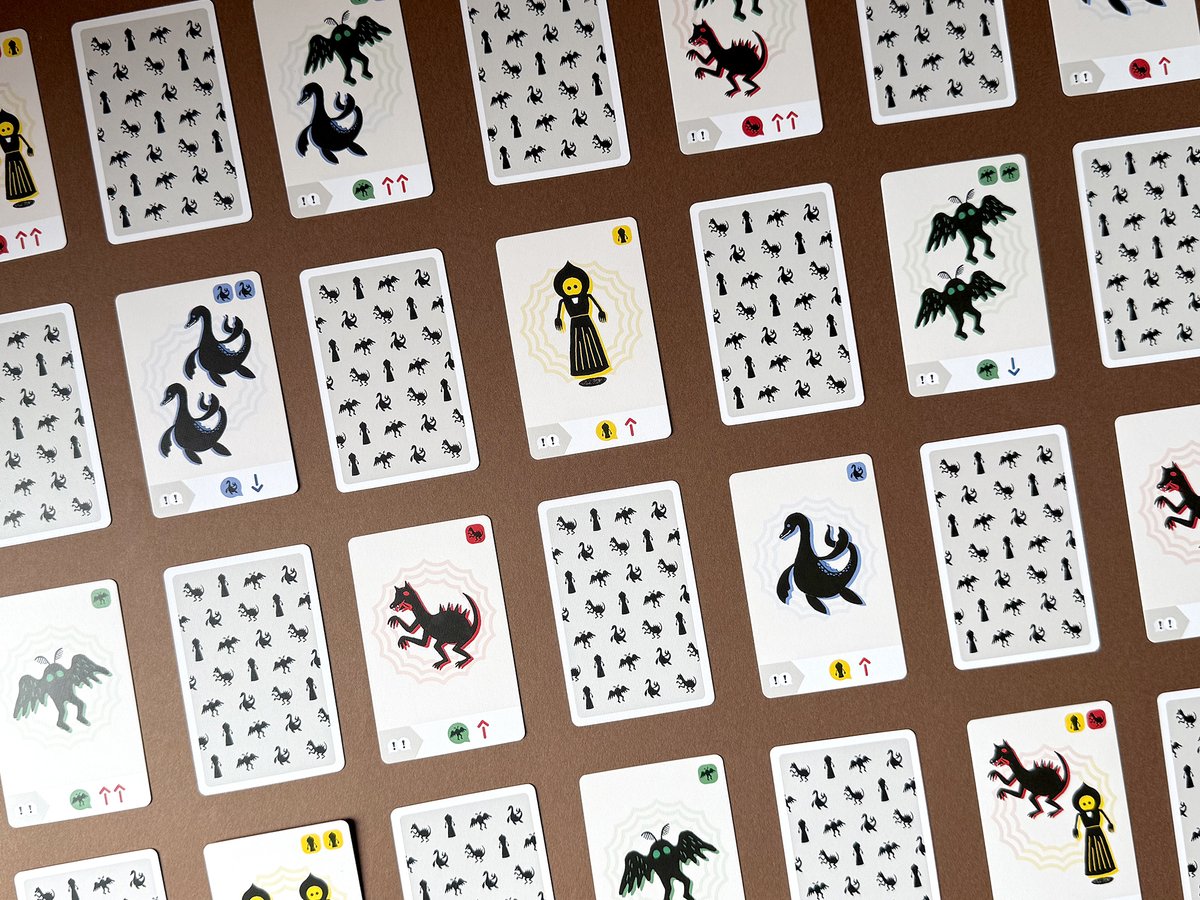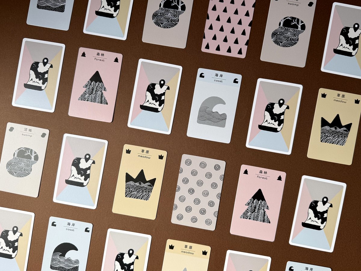 続いて、未確認生物が目撃される「場所カード」と、各プレイヤーの手札である「探索カード」。海岸、森林、沼地、草原を探索し、未確認生物の「記事のネタ」を探します。