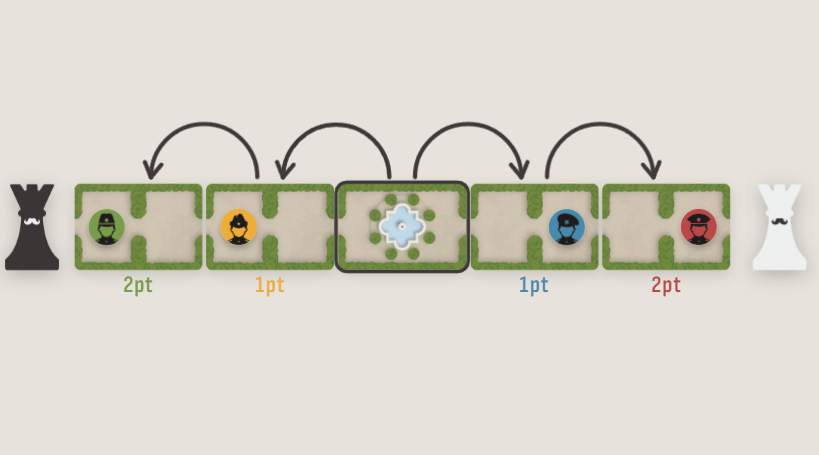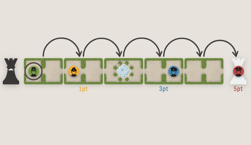 街カードから自分の兵士までの距離(カード枚数)が得点になります。