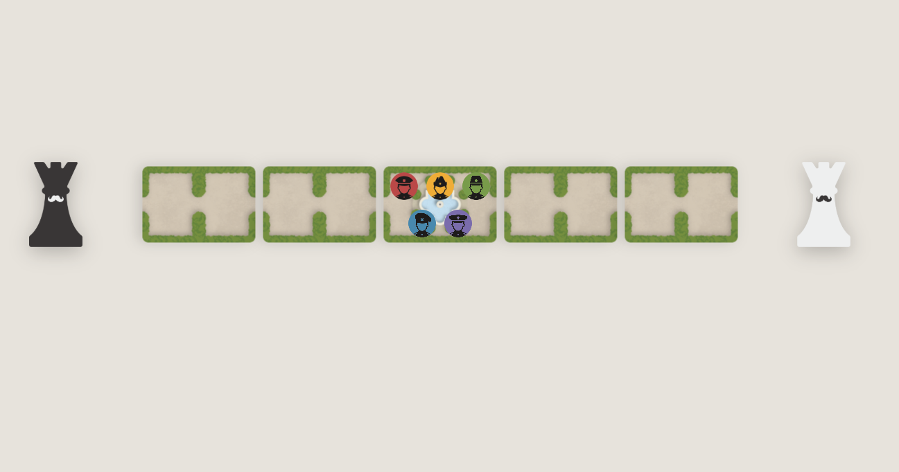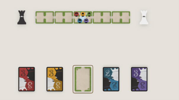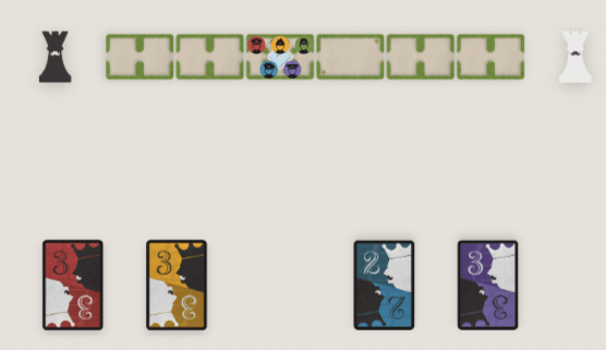 右端に右王カード、左端に左王カードを置き、各プレイヤーは自分の色の兵士コマを街に集めます。