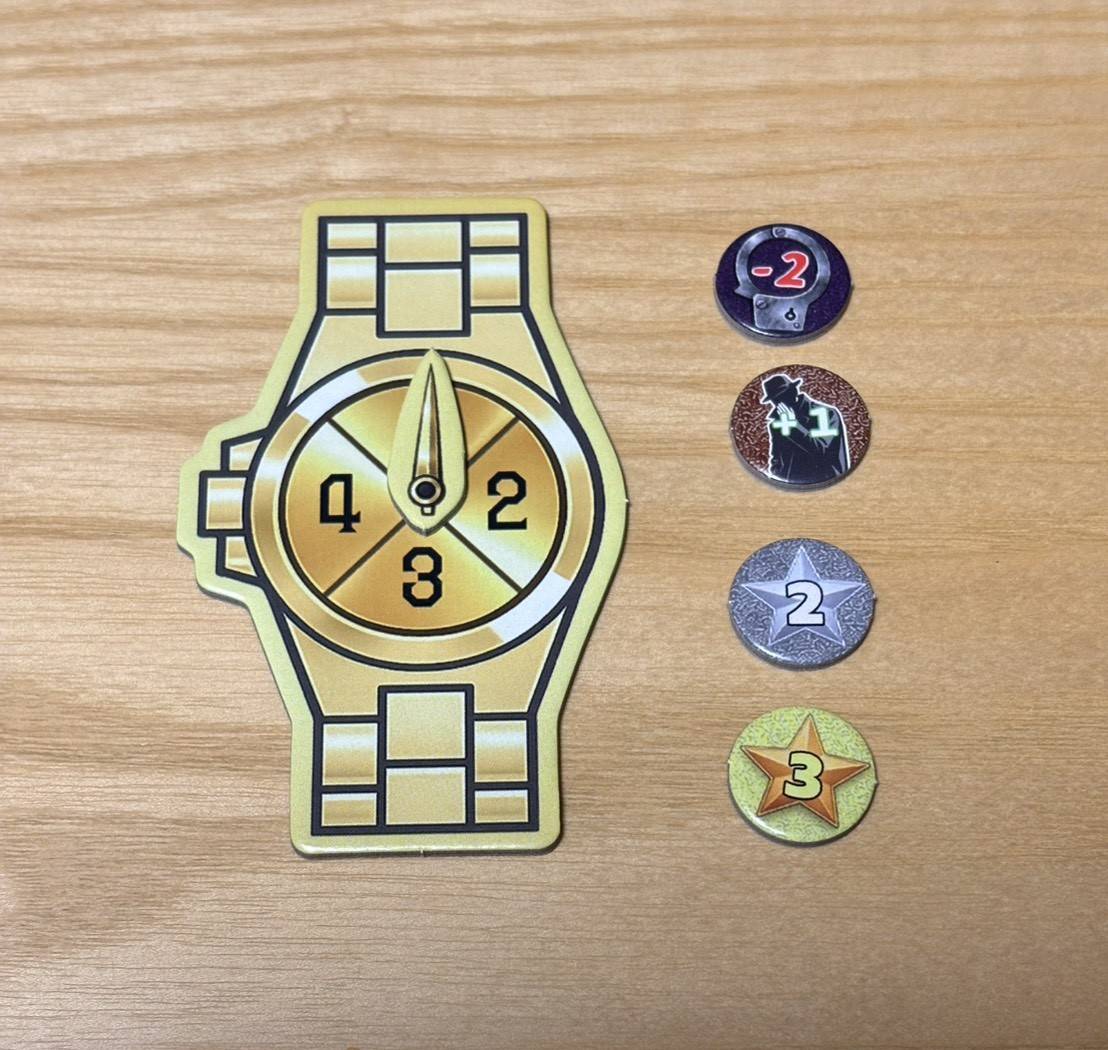 ターンを数える腕時計と秒針&ゲーム中に使う色んなチップ。