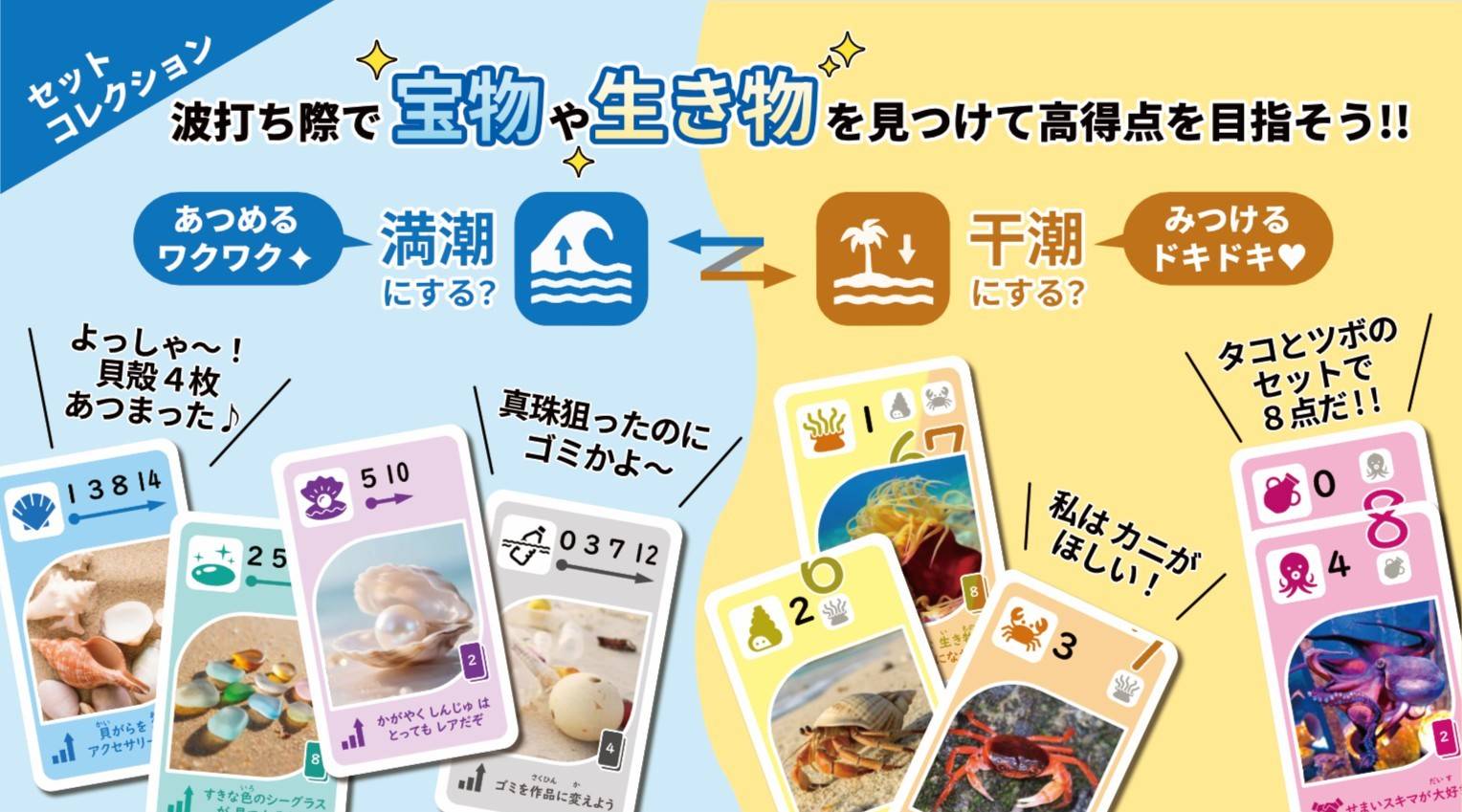 子供も大人も楽しめるボードゲームを制作している 「つきあかりゲームズ」です🌙 ゲームマーケット2026春初出展の注目ブース! 子供と遊んだ海辺のお宝集めの思い出をテーマにしたセットコレクション【なみコレ】を頒布予定!!