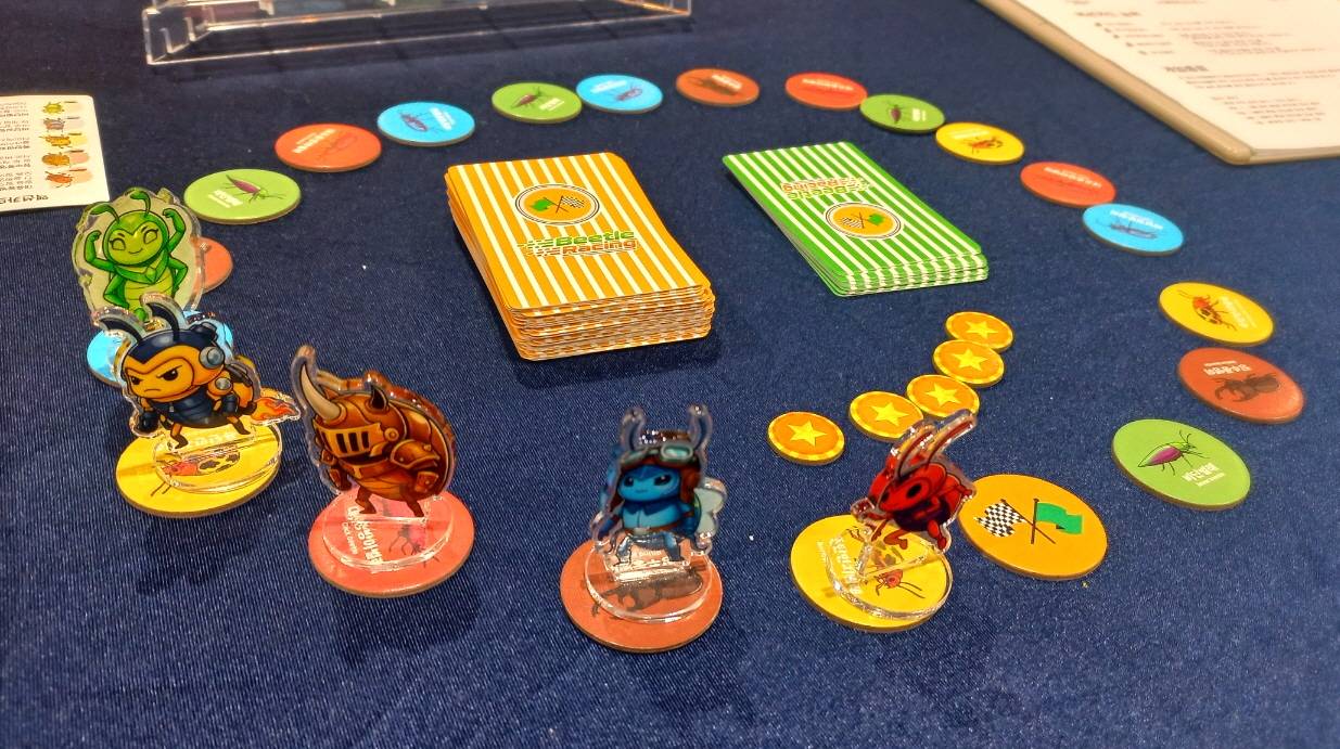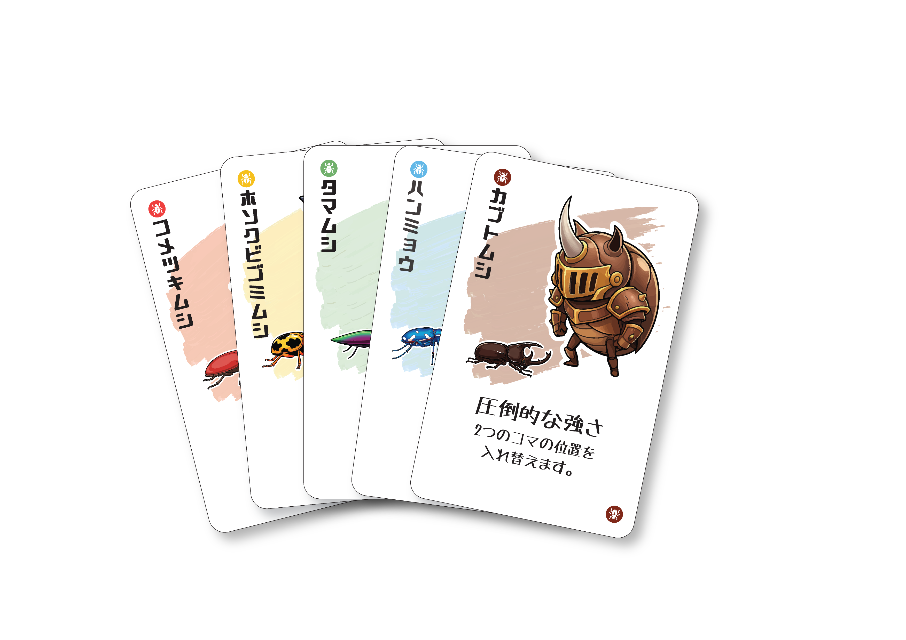 コースのタイルには5種類の昆虫が描かれており、その昆虫が描かれたタイルに移動すると, その昆충固有の「特殊能力」を発動できます。この能力を戦略的に活用すれば、一発逆転も夢ではありません! 抜きつ抜かれつの展開が楽しく、何度も繰り返し遊びたくなる『ビートルレーシング』をぜひ体験してください。