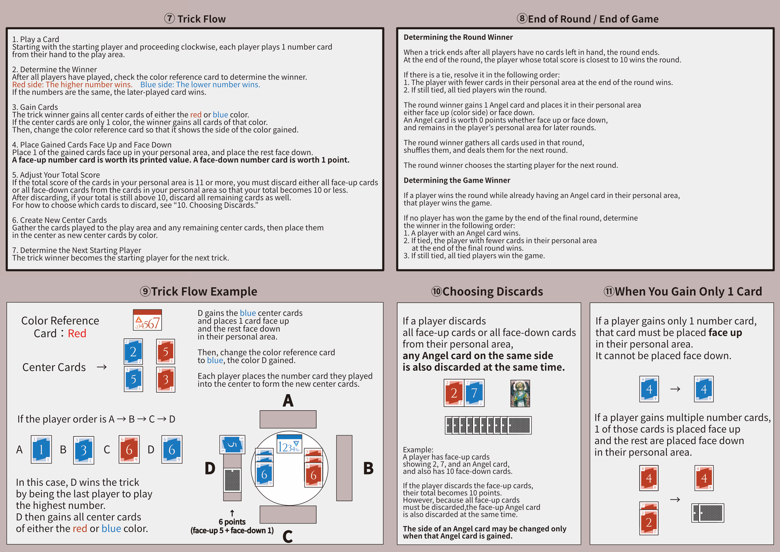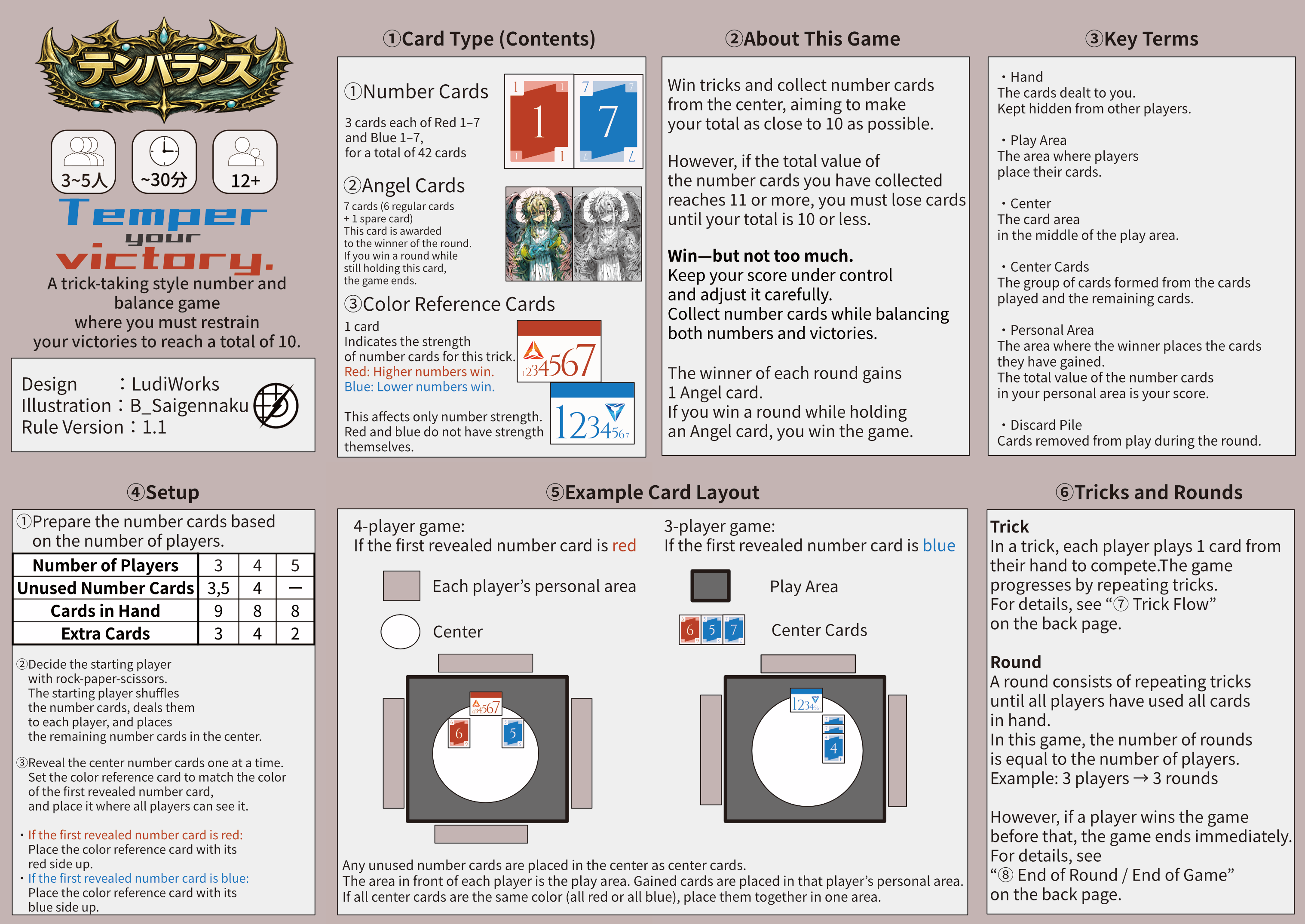 トリックテイキングの読み合いをベースに、勝利を節制し持ち点を「10」に近づける勝利調整ゲームです。