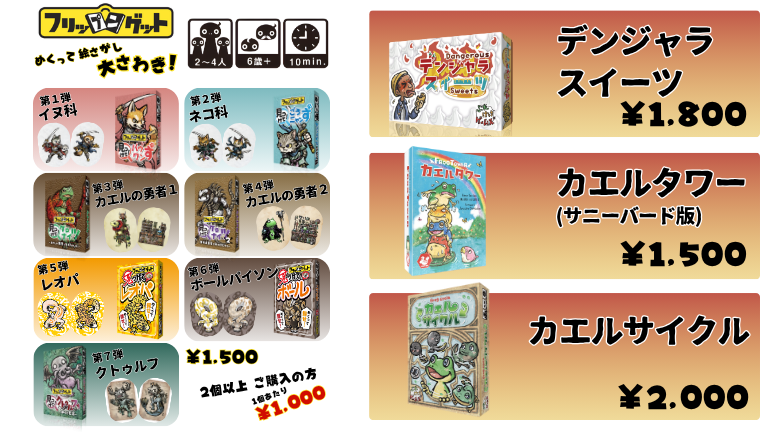 ぶれけけゲームズの『ぶれけけ』は、ハンガリー語。日本語で言うケロケロ(カエルの鳴き声)です。みんなで卓を囲みワイワイと、カエルの大合唱のように楽しんでほしいという思いをサークル名に込めました。ファミリー層やカジュアルライト層に楽しんでもらえるゲーム制作を心がけています。 カエルサイクル・カエルタワー・カエルキャッチのカエル3部作。2025春は新作を2作品『ダイスポーカーデュエル』『コロコロSAN脈』2025秋新作『デンジャラスイーツ』
