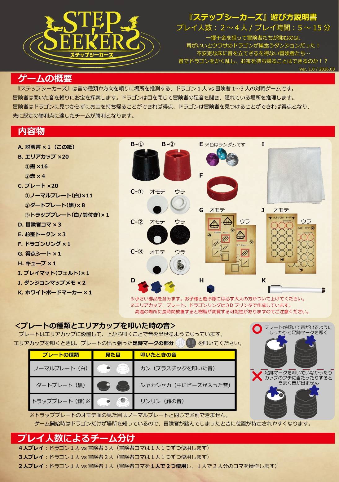 2026春ゲムマ新作 "立体聴覚"ボードゲーム『ステップシーカーズ』の説明書を公開しております。