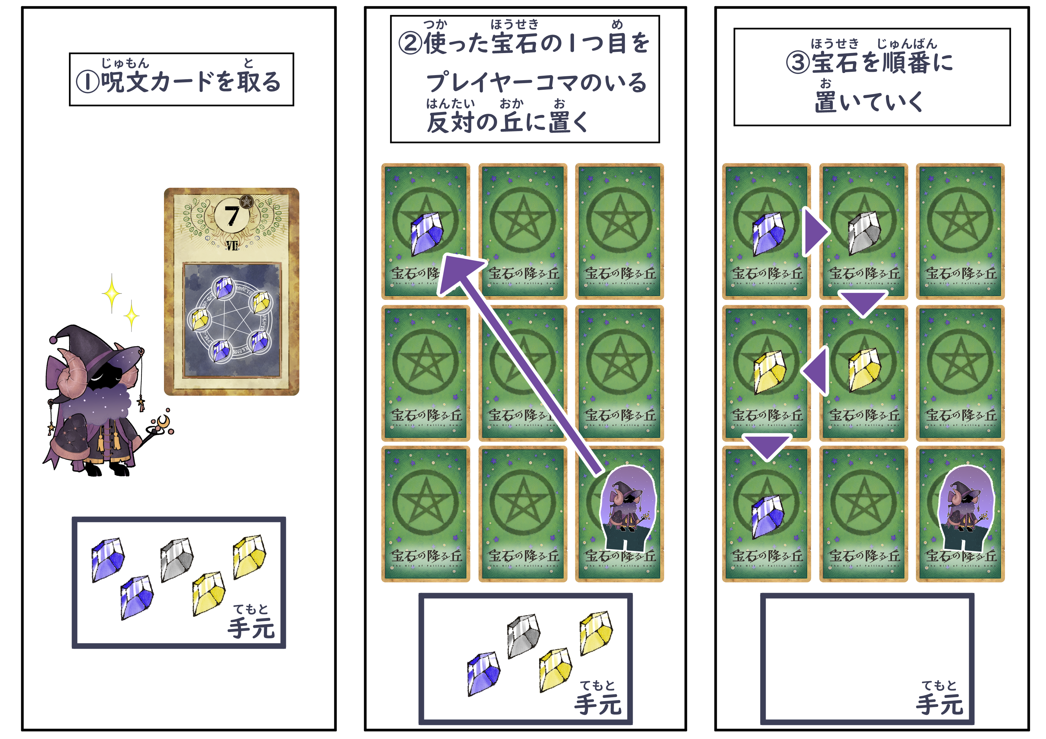 白か青か宣言. 神源の上から1枚を公開し, 宣言した色と同じ色の場合, お互いの場のその色のカードをすべて捨て札にする.(ワイルドカードを除く)