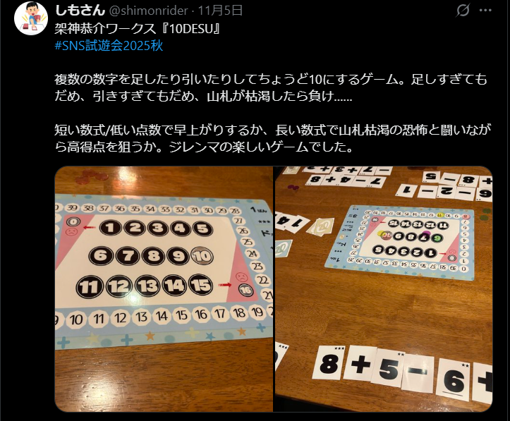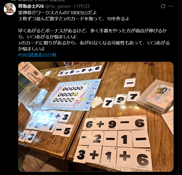 なお、この記事の原稿を書いている現在は、ゲムマ2025秋向けの「水道橋ボドゲ会」からの帰路です。丸半年かかっとるやんけ。