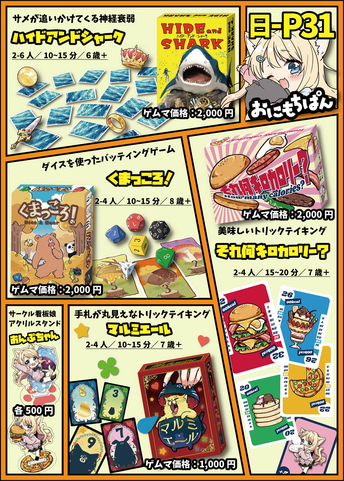 ゲムマ2025秋では、土-U30で出展いたします!新作『カクテルポーカー』についてはサークルカットをチェックだ!まだ入稿できてないからゲムマブログには情報ないぞ!ウチより遅いトコいて嬉しいね~。