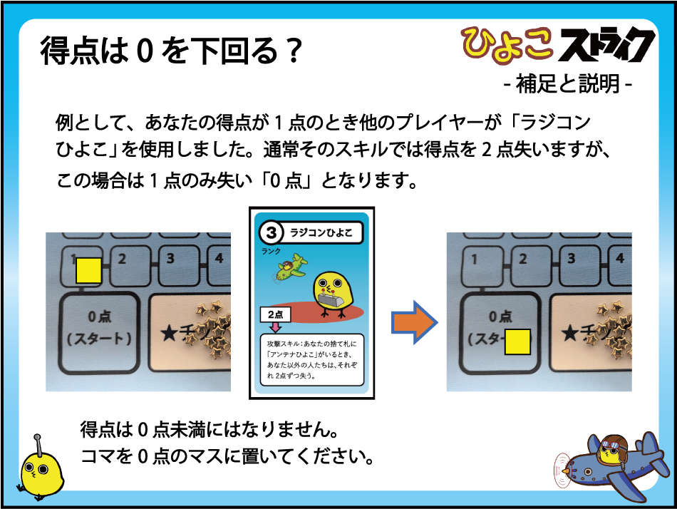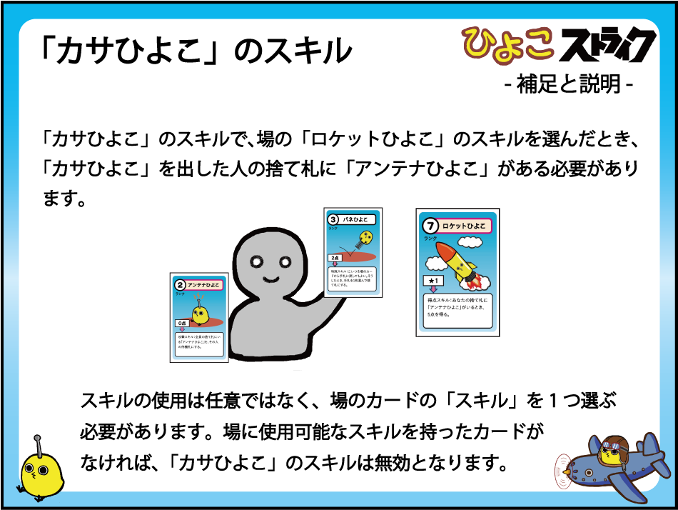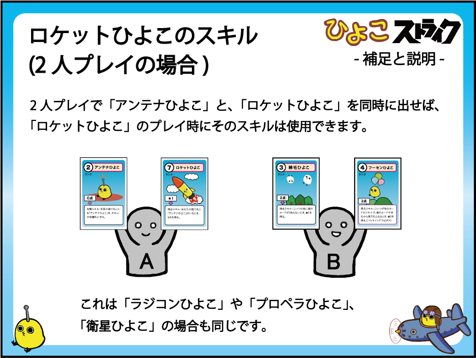 Q3:2人プレイで「アンテナひよこ」と「ロケットひよこ」を出した場合、その手番中に「ロケットひよこ」のスキルは使えるの?(「ロケットひよこ」が捨て札にされない前提です)