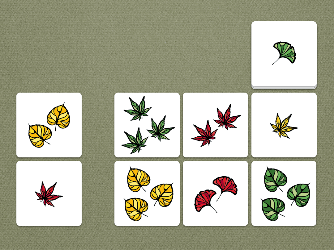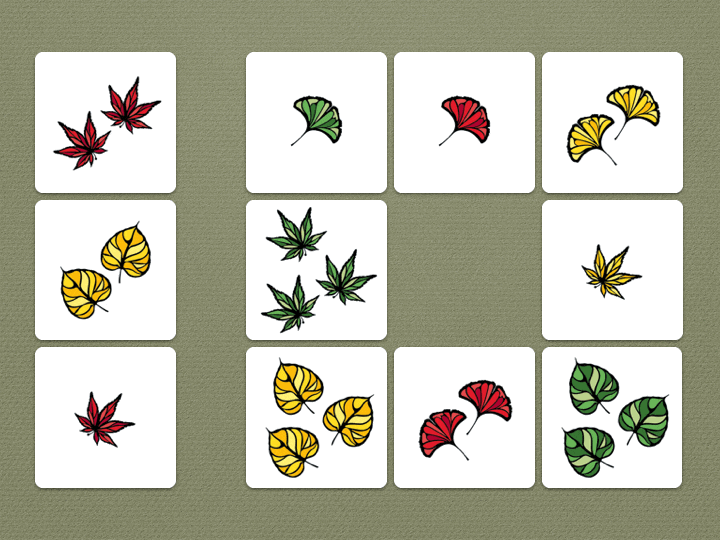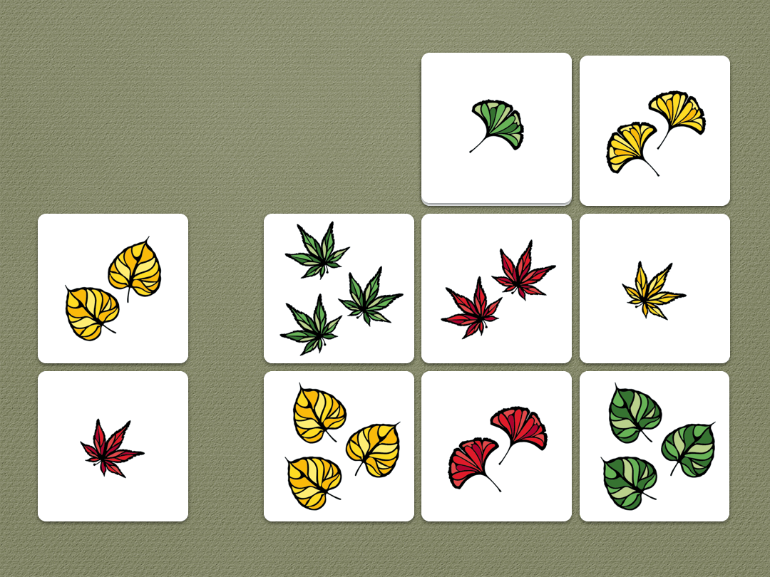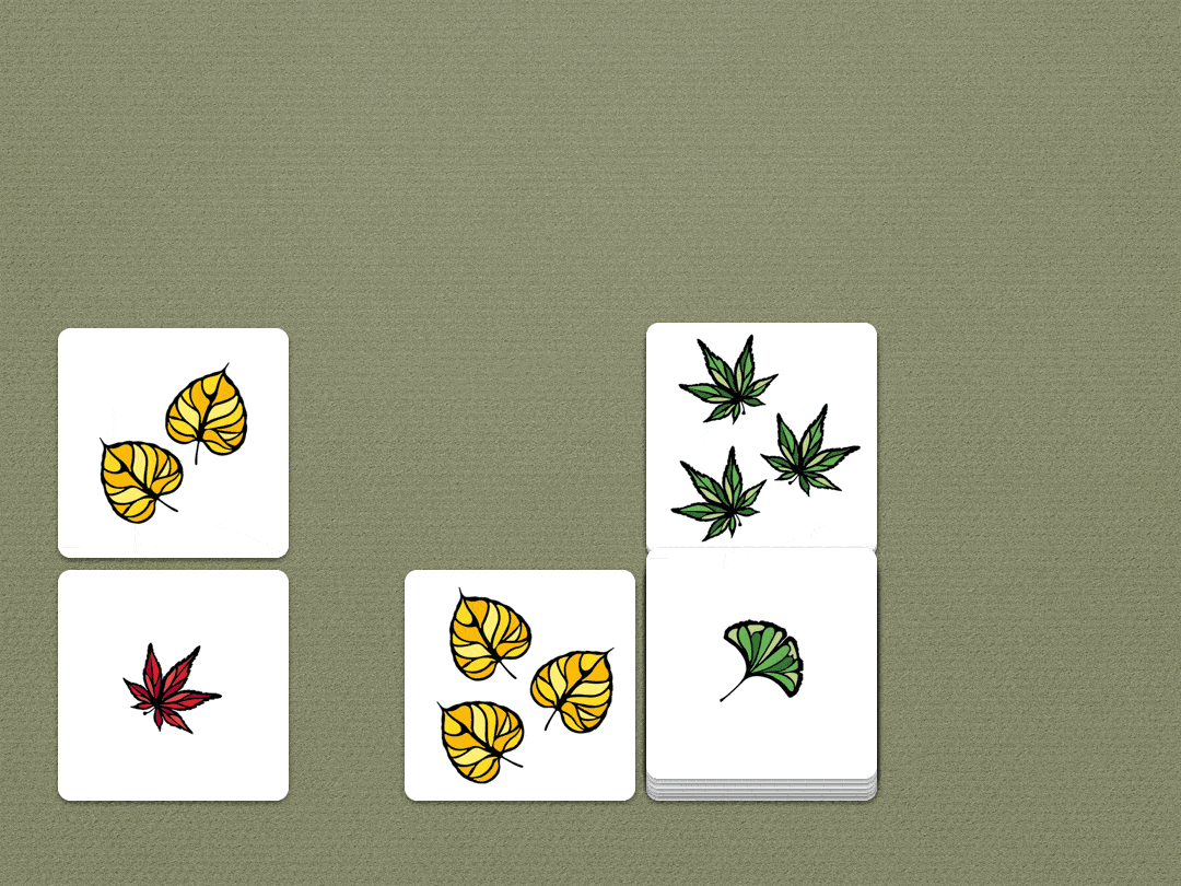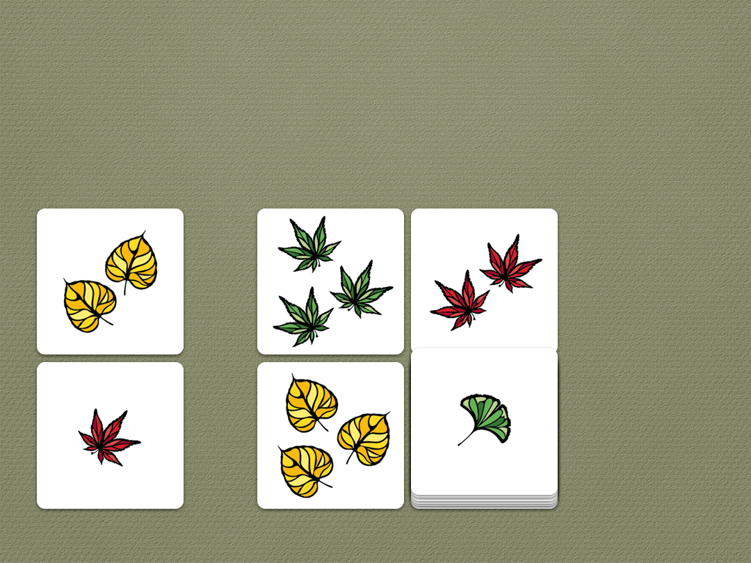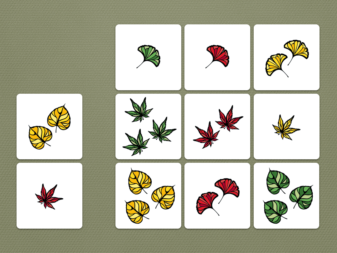 2. カードを重ねるときは、2 つのカードのいちばん上にある落ち葉どうしの共通する要素を声に出してから重ねます。