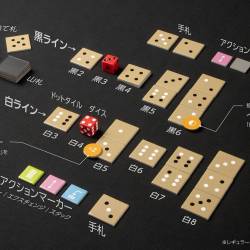 - 数をつなげて相手より先に並べきれ!シンプルでスタイリッシュな2人対戦ゲームプレイ人数:2人|時間:5〜10分|年齢:6歳〜【ゲームの概要】ダイス(サイコロ)とタイルを使った2人対戦ゲームです。白目・黒目それぞれのダイスを振り合い、出た目の数を起点に、その両隣から同じ色のドットの数がつながるようにタイルを並べていきます。複数のタイルを組み合わせたりしながら、上手に数を作っていきましょう。3種の「アクション」や2種の「拡張チップ」を使いながら、手詰まりを避けつつ手札のタイルを減らしていき、相手より先にタイルを出しきったプレイヤーの勝利です。ルールは、標準的な難易度の「レギュラールール」と、より易しくお子さまや初心者でも簡単に遊べる「ノービスルール」の2種類があります。----------【ゲームの流れ】※レギュラールールダイスを振ってスタート各プレイヤーはドットタイル4枚ずつと、3種のアクションマーカー1枚ずつ持ちスタート。オプションで拡張チップを持つこともできます。お互いに1個ずつダイスを振って、出目の大きい方が「自陣の色(白ラインまたは黒ライン)を指定」するか「先手を取る」かの選択権を得ます。出目が白ライン・黒ラインの起点に写真の例では、手前のプレイヤーの自陣が白ライン、敵陣が黒ラインです。振ったダイスの目の数はそのまま各ラインの起点になります。以後、ダイスの隣から、白・黒それぞれの色のドットの数がつながるようにタイルを置いていきます(自陣・敵陣のどちらにもタイルを置くことができます)。山札タイルを引き、手の中から場に出していく自分の手番では山札タイルを1枚引き、手の中のタイルを組み合わせ、白ライン・黒ラインいずれかの数につながるよう場に出すのが基本。3種のアクションや拡張チップを使うこともできます。タイルは組み合わせて使えるタイルのドットは白・黒どちらかの色だけをカウントして使います。複数枚組み合わせることもできます。写真の例では2枚のタイルで「白5」を作っています(白3+白2=白5)。※タイルを置く際には使用する枚数に制約があり、隣に置かれているタイル枚数よりも1枚多いか1枚少ない枚数で置かなくてはなりません。写真の例に続く「白6」の場所には、タイル1枚または3枚で置く必要があり、2枚では置くことができません。3種のアクションで攻守&手詰まり回避3種のアクション〈リドロー(山札から引き直し)〉〈エクスチェンジ(相手と手札交換)〉〈スタック(重ね置き)〉を使って手詰まりを回避したり、相手を妨害したり、積極的に攻めることも重要な戦術ポイントです。拡張チップ〈ダブラー(タイルの数を2倍にカウント)〉〈インバーター(タイルのドット色を反転)〉も上手に使いましょう。手札のタイルを出し切ったら勝ち!交互に手番のプレイを繰り返していき、手札のタイルを場に出しきるか、または自陣に6列(ダイスを除く)並べたら勝利、手詰まりになったら敗北です。勝利のためには引き運も必要!ゲームルール詳細は → こちら----------Bossa/坊茶には6つのエディションがあります。詳しくはバナナムーンゲームズwebサイトで。→ スタンダードネオ版→ クラシック版/匠のアート版“水”/匠のアート版“花”→ クラシック ネオ版/匠のアート版“雪”----------お求めはバナナムーンブースにて【土日両日・H22】