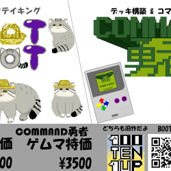 - 11/22(土)ゲームマーケットの出展で100TEN1UPは【Q16】ブースになりました! 持っていくゲームの本数は少なめですので、予約したい方は11/14(金)までに下記のポストにリプかDMをください! https://x.com/KurokiYosuke/status/1985976457206886445 (引取時にご本人様確認をお願いする場合がございます。) ▼頒布作品・COMMAND勇者ゲームマーケットサイト https://gamemarket.jp/game/183936 ・HATCATゲームマーケットサイト https://gamemarket.jp/game/183937