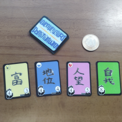 - 【ストーリー】領主は憂鬱であった。若かりし頃から、陰謀渦巻く政界を生き残り、海も異郷も支配し、領土を広げ、その繁栄を極めた。暗黒の時代も潜り抜け、ときに錬金術に手を出したり、ときに祭をしたりギルドに顔を出したりして、巨万の富を得、数多の民から信頼され、愛する家族にも恵まれた。しかし、領主の心はなぜか虚しいのである。領主は自問する。「果たして私はどのように生きていけばよいのだろうか・・・」 *******************『ドミニマムン』は2人対戦用"脱"デッキ構築型カードゲームです。プレイヤーはゲームの途中、様々なカードを獲得しデッキに加えていきますが、いずれは捨て去っていくべきものです。相手より先にデッキを減らし、"解脱"を目指しましょう。それではLet's断捨離!*******************プレイヤーの初期デッキは4枚。「富」。 「地位」。 「人望」。 そして「自我」。 さらに8種類のカードを場札として並べます。ゲームに使うのは、これら合計16枚のみ。たぶんおそらくゲームマーケット2015秋に初出展した当時、存在する中で(当社調べ)、最少枚数でプレイできるデッキ構築型ゲームでありました。 ちなみにこれらのカード、すべてこのサイズ(36×50mm)。同じく、たぶんおそらく2015秋当時、最小サイズのデッキ構築型カードゲーム。 そのため、おおむね、このようにうつむきがちなプレイスタイルとなります。