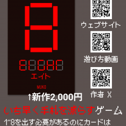 - こんにちは!むこちゃん開発局です初出展に向けて、色々と準備を進めています!印刷したものを箱詰めしたり、敷布を用意したり、ウブサイトなどの作成や更新など・・・仕事がちょっと忙しかったり、今月初週にはコロナにかかってしまったりと予期せぬトラブルでかなりヒヤッとしていましたもうすっかり元気なので、当日が楽しみです! 基本的に用意は完了しているのですが、PaypayのQRコードが間に合うか、チラシの到着が間に合うのかだけが残っています!↓QRコードもチラシも到着しました!当日のPaypay支払いに対応できます!(設定急いでがんばります!) 【お品書き】初出展かつ1点のみ制作したので、これ一本です8 エイト:2,000円ゲームの詳細についてはこちらのゲームページを御覧ください!なるべく手札を捨てるというわかりやすいゲームになっていますhttps://gamemarket.jp/game/186758/?preview=58182b82110146887c02dbd78719e3d5予約フォームはこちらです!https://forms.gle/WyZ44N1hBLTCGwks8 遊ぶのが好きでしたが、今回制作に挑戦してみました当日たくさんの人に会えることを楽しみにしています!