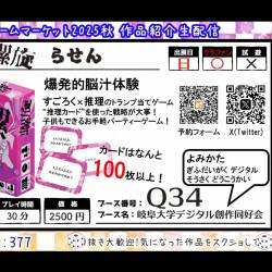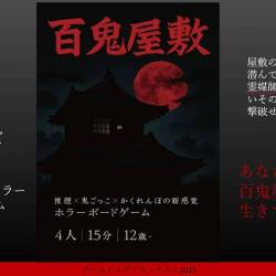 - こんにちは!岐阜大学デジタル創作同好会です! 本日は『螺旋』ではなく、一緒に販売予定の『百鬼屋敷』というボードゲームの紹介をします!以下説明文を追記します!!ぜひこちらもチェックしてください!! 百鬼屋敷 妖怪 対 霊媒師勝つのはどっちだ 【ゲーム概要】 ・このゲームは 妖怪1人 vs 霊媒師3人に分かれて戦う。 妖怪は全8種類いて、 HP・速度・有効な呪具がそれぞれ異なっている 霊媒師たちはこの屋敷のどこに、どんな妖怪が潜んでいるのか不明である。 潜む妖怪の種類と居場所を推理し、 呪具を使って撃破せよ! 「緊張のハントターン 」特定のターンになると妖怪が霊媒師を襲撃してくる。この瞬間は要注意─すぐに逃げろ! ・正体を突き止める洞察力、相手がどこにいて、いつ襲ってくるのか分からない恐怖、 そして勇気が勝敗を分ける。 ①. ゲームの目的 屋敷の中に潜む妖怪を退治するため、3人の霊媒師が協力して戦います。 妖怪役は霊媒師を追い詰め、全滅させれば勝利です。 ②.勝利条件 霊媒師側:妖怪のHPを削り切り、撃破する。 妖怪側:霊媒師を全員ハント (殺害)する。 ③. 準備 1.カードの準備霊媒師役3人と 妖怪役1人に分かれます。 妖怪カード (8枚)をシャッフル。 妖怪役の人は1枚引き、裏向きに保持。(霊媒師には非公開) 部屋カード(11枚)をシャッフルし、 妖怪役が1枚引き初期位置を決める。 これも裏向きに保持。(霊媒師には非公開) 呪具カード(16枚)をシャッフル。霊媒師1人につき3枚配布し、机の上に表にして置く。残りは山札にする。2. 駒の配置 霊媒師はマップの「寝殿」に駒を置く(初期位置)。 妖怪は駒を置かず、 場所は非公開。 ④.ゲームの流れ (1ターンの進行) 1、ハントターン判定 初ターンはこれを行わない。 2ターン目以降、サイコロを振る。 5か6でこのターンは 「ハントターン」となり、ターン の最後に霊媒師をハントできる。 ※妖怪がダメージを受けるたび、それ以降成功確率が1段階上昇する。 (例:妖怪が2ダメージを受けていた場合、 3,4,5,6が出たらハントターンとなる) 2、 呪具の更新 (任意) 霊媒師は手札から1枚を山札に戻し、 シャッフルした後、新たに1枚引ける。(しない選択も可) 3、霊媒師の移動 各霊媒師は最大3部屋まで移動可能。移動しない選択も可。 4、呪具の使用霊媒師は移動後の自分のいる部屋で呪具を1つ使用可能。妖怪が同じ部屋にいて、かつその妖怪に有効な呪具なら妖怪のHPに1ダメージ。 ※効果があった呪具はトラッシュし、山札から1枚補充する。 (妖怪役は、 攻撃でダメージを与えられた場合、 「攻撃が命中した」といいそれ以外では「何も起きなかった」といいます。) 5、妖怪の移動 妖怪役は速度値までの部屋を移動可能。 移動しない選択も可。 移動前のカードを部屋カードの山に戻し、 移動先のカードを裏向きにして自分の前に置く。 (ハントターンの場合は追加で+1移動できる) 6、ハント(ハントターンの時のみ) 妖怪が霊媒師と同じ部屋に到達した場合、その部屋の霊媒師を一人即座に殺害できる。 殺害された霊媒師の呪具は山札に戻す。 以上 1~6を霊媒師、もしくは妖怪のどちらかが勝利するまで繰り返す。 ⑤. プレイのコツ はハントターンではない時では逃げて、 ハントターンが来たら攻める、 かくれんぼのような戦い方が重要! 霊媒師はハントターンになる確率の低い序盤ではなるべく分散し、素早く妖怪の居場所を特定することが重要!