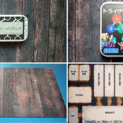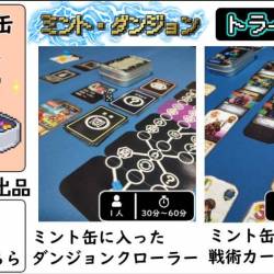 - 初めまして、ミント缶ゲームです。この度初出展いたします! 手のひらサイズのミント缶ゲームを2作品ご用意しました。持ち運びやすく、ちょっとした空き時間にも楽しめる内容になっています。 10月16日より取り置き開始しました。ミント缶ゲームス取り置き予約ページ*---おしながきーーー* 『ミント・ダンジョン』 スレスパ風のマップを進むダンジョンクローラーです。最後に待受けるものは・・? プレイ動画はこちら 小さな缶の中にカード(大・小)、サイコロ、ミープル、ミニチュア、トークン等ぎっしり詰まってます。 ミント缶ゲームならではのちょっとした工夫も入れております。 ゲーム紹介リンク「ミント・ダンジョン」(動画あり) 『トライグリフ』 手軽に遊べる、規定ターン内に全ての敵を倒す戦術カードゲームです。 各モンスターの裏面にはボスが描かれており、条件を満たすと出現。 毎回配置も変わり、リプレイ性もあり奥深いゲームです。 ゲーム紹介ページ「トライグリフ」(動画あり)どちらも「少ないカード枚数でもしっかり楽しめる工夫」をぎゅっと詰め込みました。初めての出展でドキドキしていますが、多くの方に遊んでいただけたら嬉しいです!詳細やルールは上記リンクからご覧ください。 映えるプレイマット思わず「ばえーー!」と言いたくなるようなダークオークデザインのプレイマット。滑り止めもついており、どんなボドゲにも合います(610mm × 355mmサイズ)。SNS投稿時等にもご利用ください。 トライグリフプレイマットトライグリフ用にデザインされた、滑り止めつきプレイマットです (610mm × 355mmサイズ)。専用に作られているため、プレイアビリティの向上に役立ちます。※参考用に製作したもののため、在庫は非常に少ないです。※プレイ動画で利用しているプレイマットです。 詳細についてはどんどん追加します。お楽しみに!