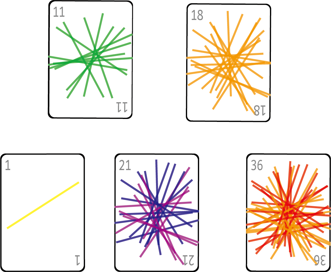手札の「エダ」カードが同じ色を含むカード6枚揃ったら勝利です。