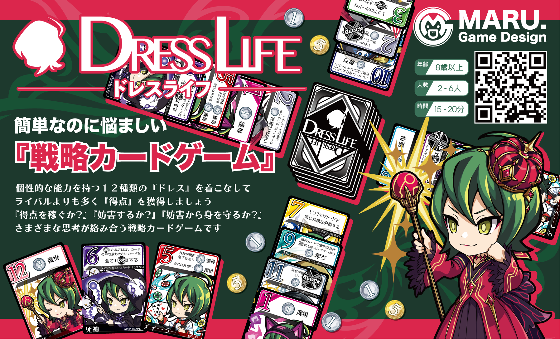 さまざまな効果を持つドレスを着こなして、誰よりも先に25点の獲得を目指す対戦ゲームです。
